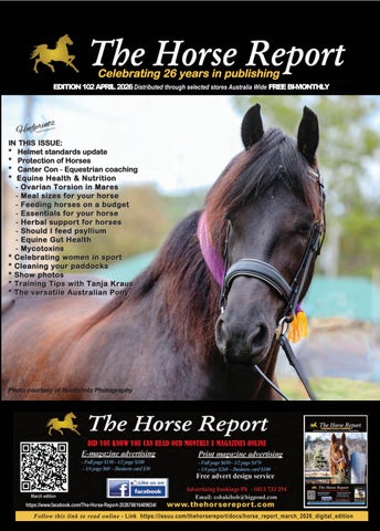 The Horse Report it is a cost effective Equestrian magazine distributing 13,000 printed copies available FREE to readers in saddleries and produce stores in NSW and Queensland. The Horse Report tries to cover all disciplines from pony club to polo, rodeo to racing, show jumping to show horse, harness, campdrafting and much much more And as of early 2011 we are now available online to ensure no-one misses out on an issue no matter where you live. So if your looking to planning your advertising budget please consider including The Horse Report in your budget Upcoming Advertising Deadlines 24th of each month contact: Paula Anthony - Ph 07 55909721 www.thehorsereport.com Email:cobakibob@bigpond.com