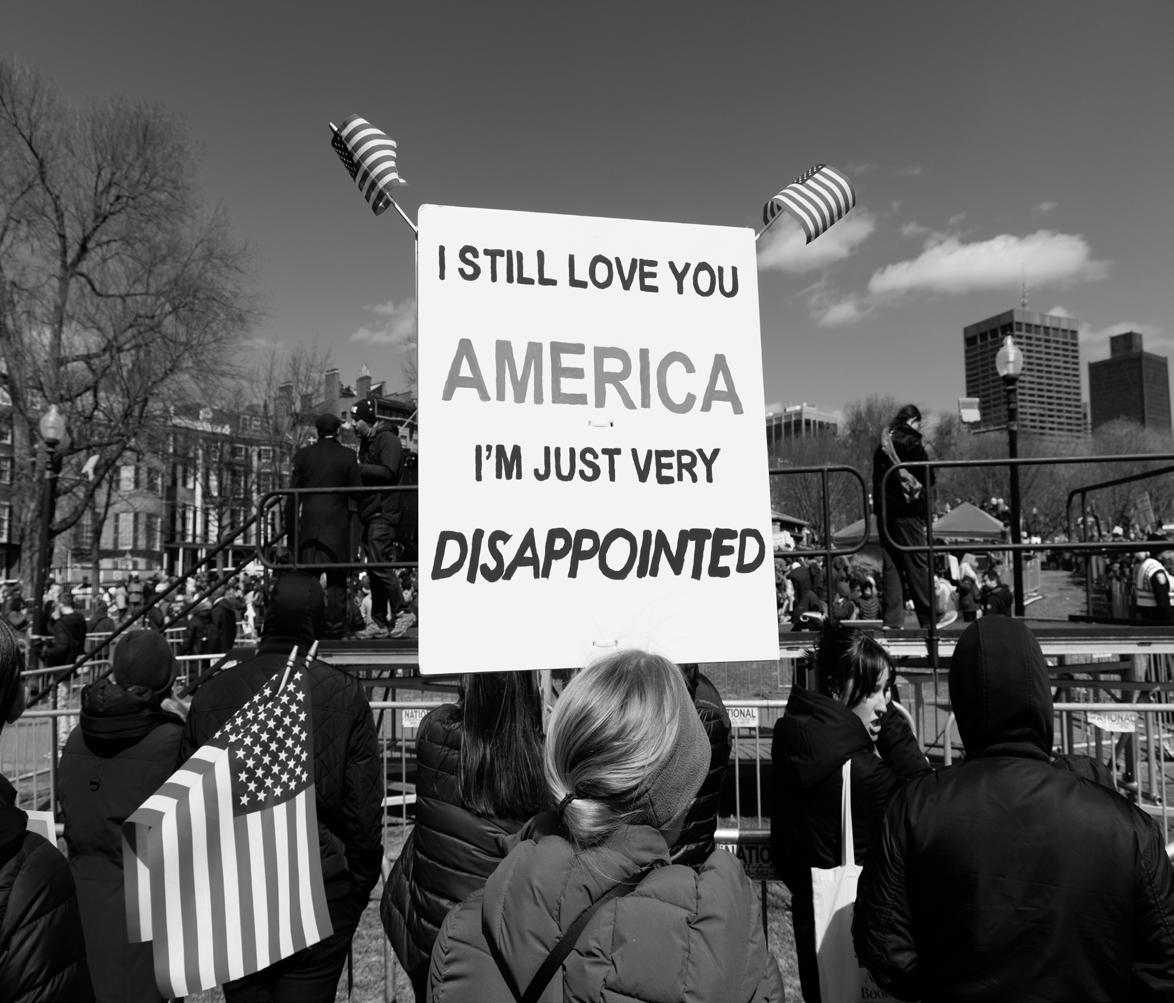 A protester holds a sign reading, “I still love you America, I’m just very disappointed.” Attendees brought custom-made costumes, signs and flags to the protest.