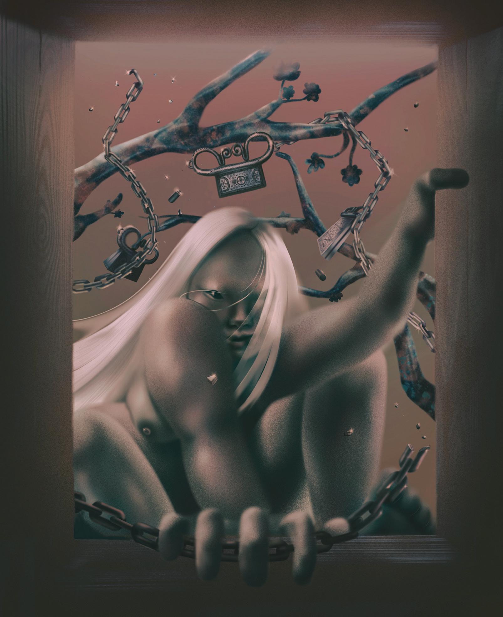 Just as Black femininity has been erased by a cultural logic that insists upon the sub-human ness of “transitional mere flesh,” yellow femi ninity is made non-human through alignment with objects and decoration. Both readings impress a kind of legibility on the racialized body that denies interiority, and establishes a scale for femininity which leverages race as two opposing weights, Black women representing too much and Asian women not enough. As a result, both are rendered vulnerable to violence, sexual and otherwise, that is inextricable from objecti fication, for without interiority, one cannot feel pain. Roland Barthes may suggest “where there is a wound, there is a subject,” but refusal to read deeper allows the violent actor to view these traces as mere scratches on a surface.