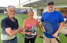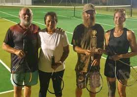 Mercury Bay Tennis Club Mixed Doubles Club Champs were held on Tuesday night. Jackie King and Jason Mcloughlin receive the Plate trophy from Peter Grant (left).