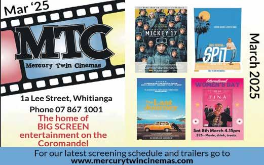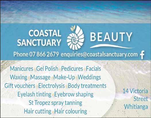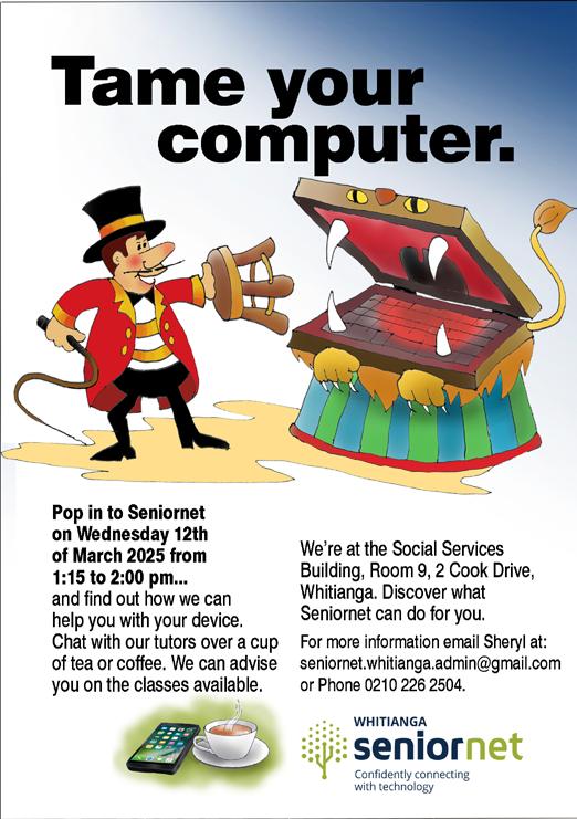 Mercury Bay Lions Club – New members are welcome. Email mercurybaylions@gmail.com. Phone Barb 0274 075 268. SeniorNet Whitianga Incorporated – Learn more about new communications and information technology. Contact Sheryll Carruthers 021 022 62504 or email seniornet.whitianga.admin@ gmail.com.