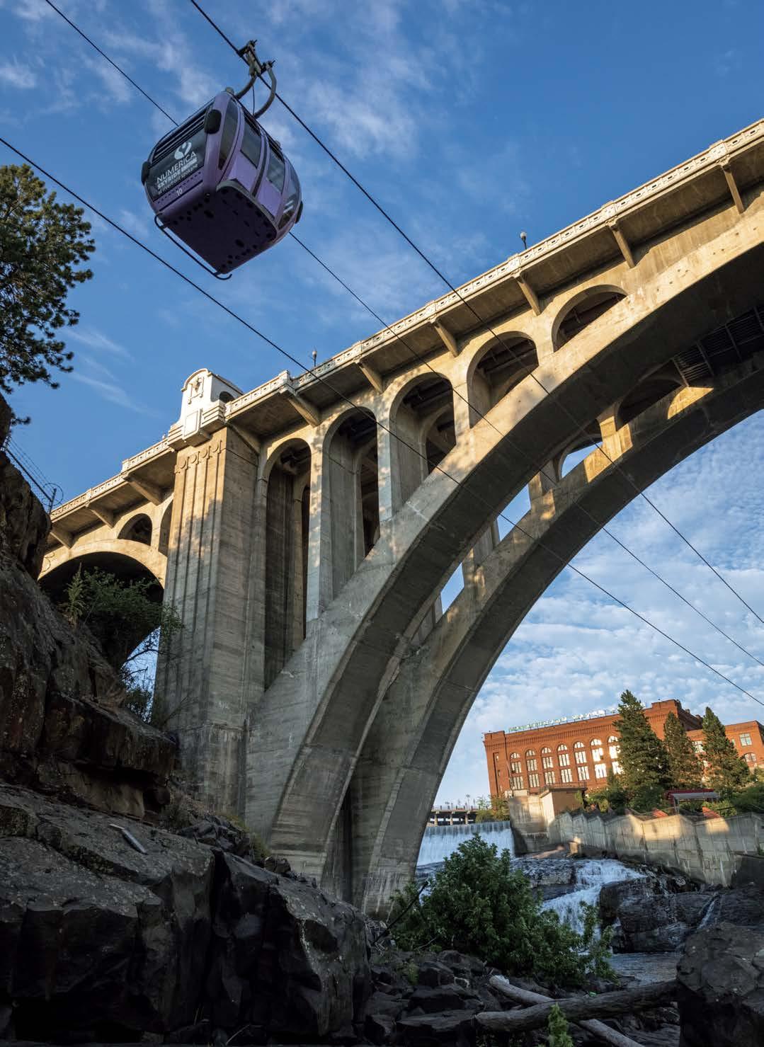 The new structure retains the bridge’s iconic open spandrel arch deck design but is deliberately multimodal, which means that it caters to pedestrians and cyclists as much as vehicles. One goal was to integrate the bridge more naturally into nearby Riverfront Park, so its planters and benches incorporate the park’s modern design aesthetic. The bridge also functions as an access point for the Centennial Trail and the Great Gorge Loop Trail.