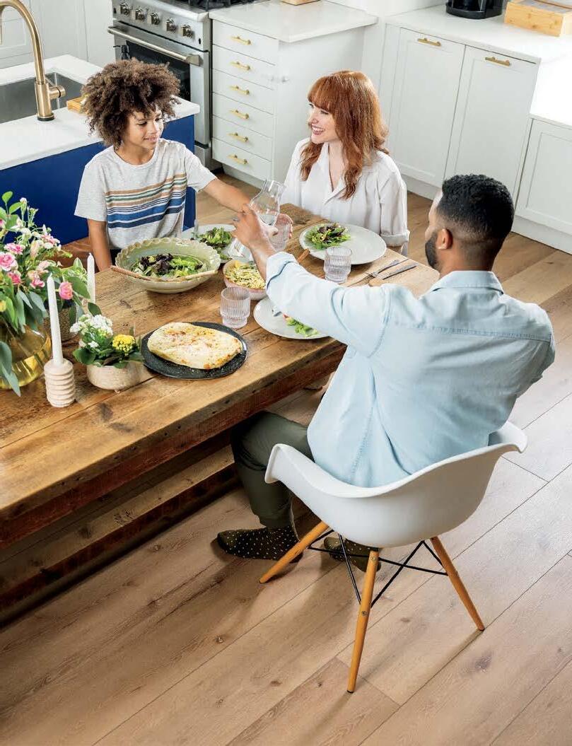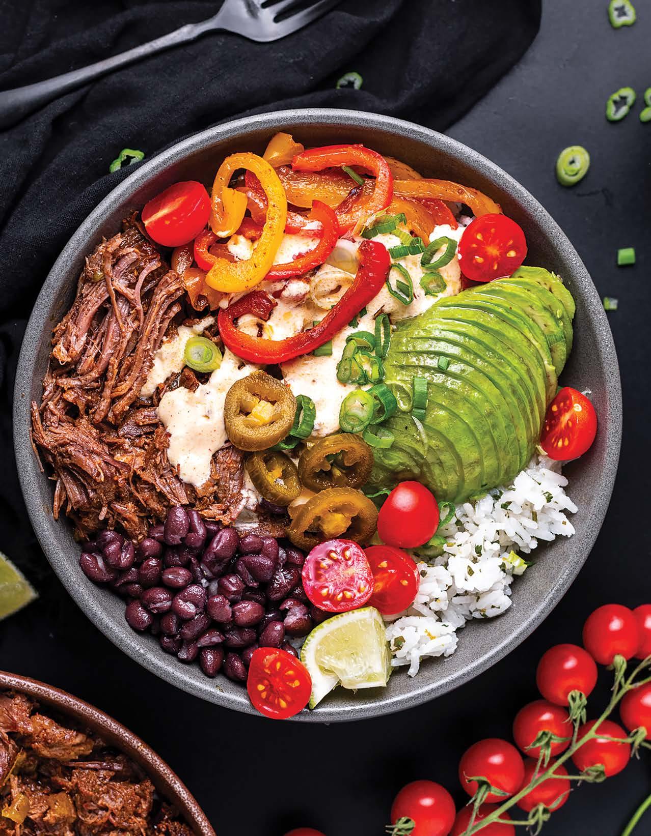 easy-to-digest suggestions along the way. A simple round graphic assigned to each recipe reveals at a glance the parts of the balanced plate it contains; quite a few recipes contain all the elements, and it’s easy to spot what’s missing to fill in the gaps on others. Recipes are easy to follow and don’t require elaborate technique; ingredients are, for the most part, familiar and inexpensive. But while it all appears rather straightforward, the recipes are carefully crafted and vetted, not just for flavor (by the duo’s coworkers and young kids), but also for optimum nutritional value.