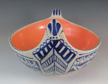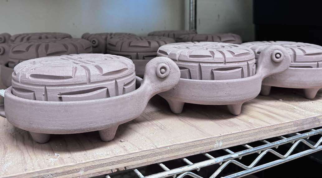 “I like functional and decorative pieces. I do a lot of different kinds of surface decoration,” she says, noting she often throws something on the wheel and then alters it. “You can take it out of its form by either cutting into the piece or pushing and pulling on the piece, and then I sculpt on the exterior of that.”