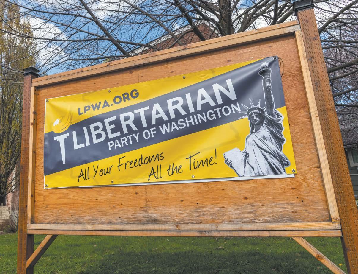“Taxation is Theft!” reads the flag flying above the Woman’s Club of Spokane, where about three dozen liberty-minded people from across the state have gathered for the Libertarian Party of Washington’s annual convention.