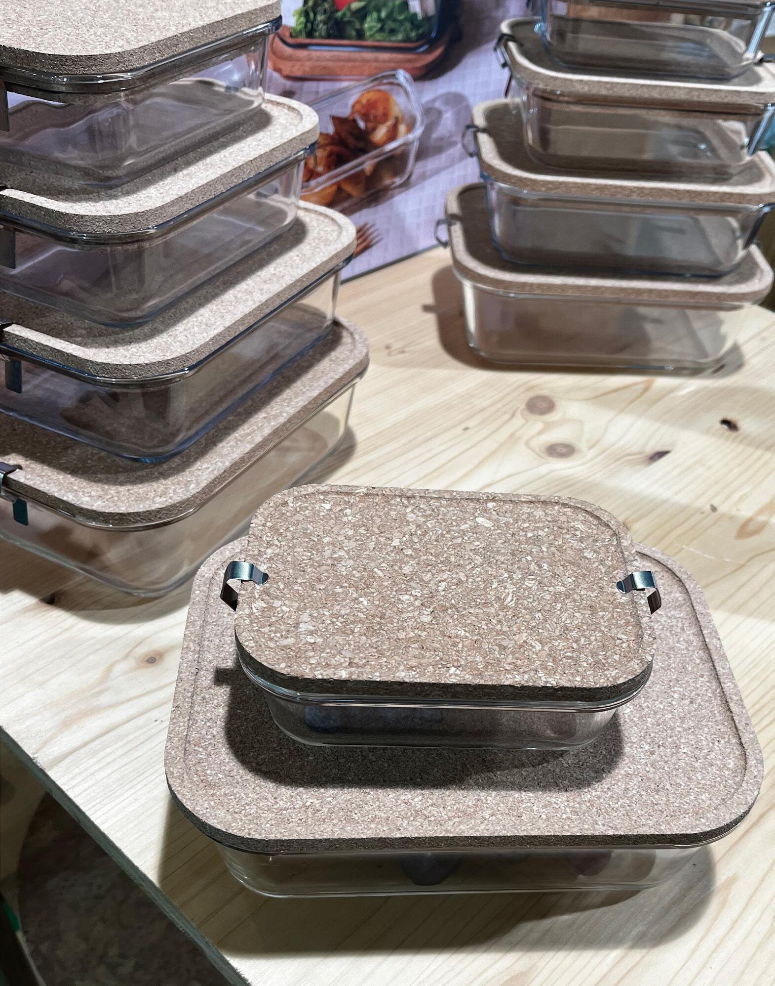 (recycled cork lids double as trivet; freezer, oven, mw, dw safe, clips provide secure food storage)