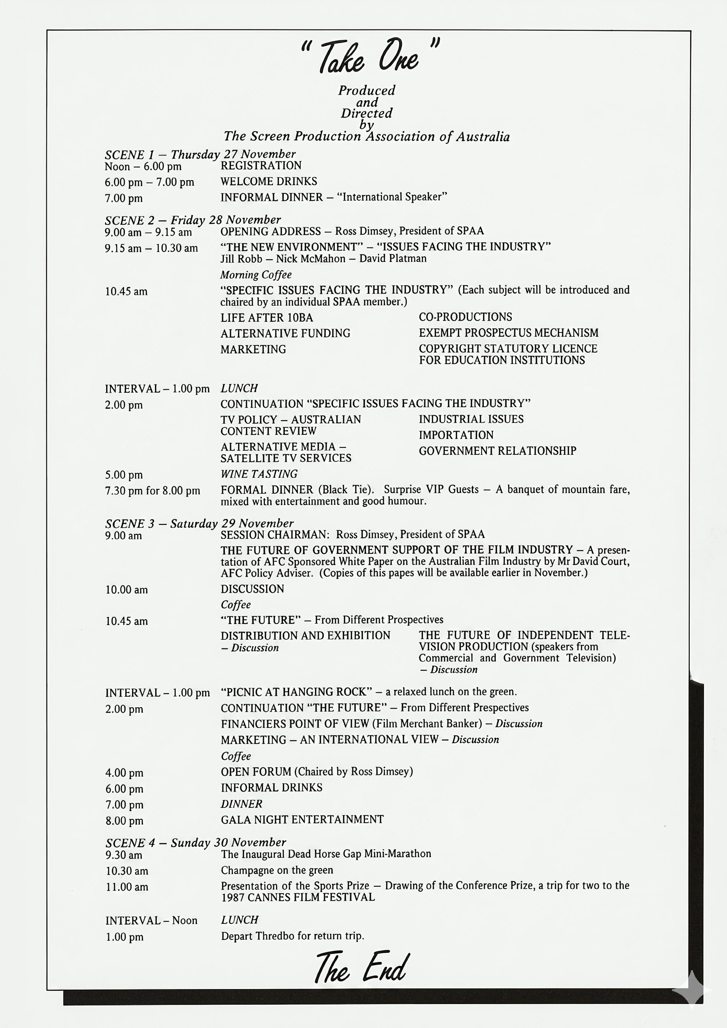 The more things change, the more they stay the same. While some of the agenda items at the first Screen Production Association of Australia conference in 1986 are of the time – “life after 10BA” being one – most wouldn’t be out of place today, some 40 years later. Sessions at the conference, dubbed ‘Take One’, were held on co-productions, marketing, alternative funding, distribution and exhibition, as well as the future of independent TV production and government support of the industry.