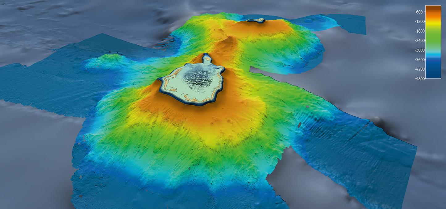 “We’ve used the full ocean-depth mapping capabilities of RV Investigator to completely survey around the Cocos (Keeling) Islands, from coastal depths less than 100 metres all the way down to the abyss some 4,800 metres below,” said Nelson. “The data set now covers a substantial area of the new marine park and shows the Cocos (Keeling) Islands as the twin peaks of a massive seamount that rises nearly 5,000 metres from the