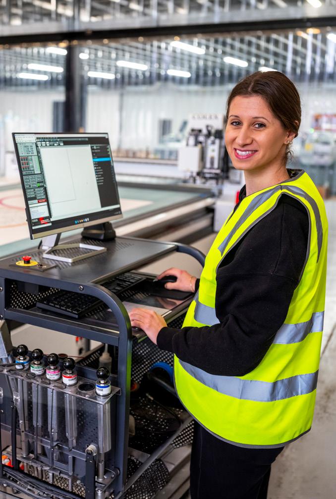 The Fleetmark team has located the Zünd in a fully-enclosed, temperaturecontrolled room with sliding doors, providing direct access for full sheets and half sheets of material to be loaded directly on to the machine. The floor was levelled with epoxy resin to assist with installation and setup.