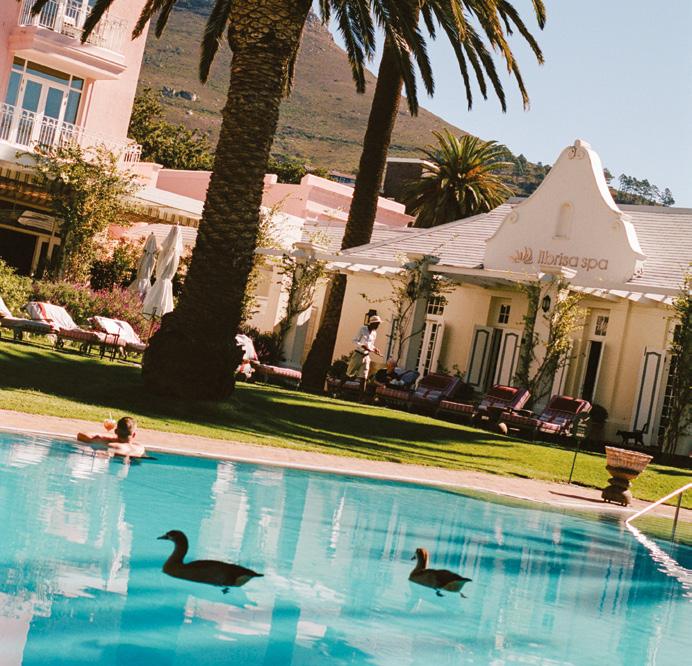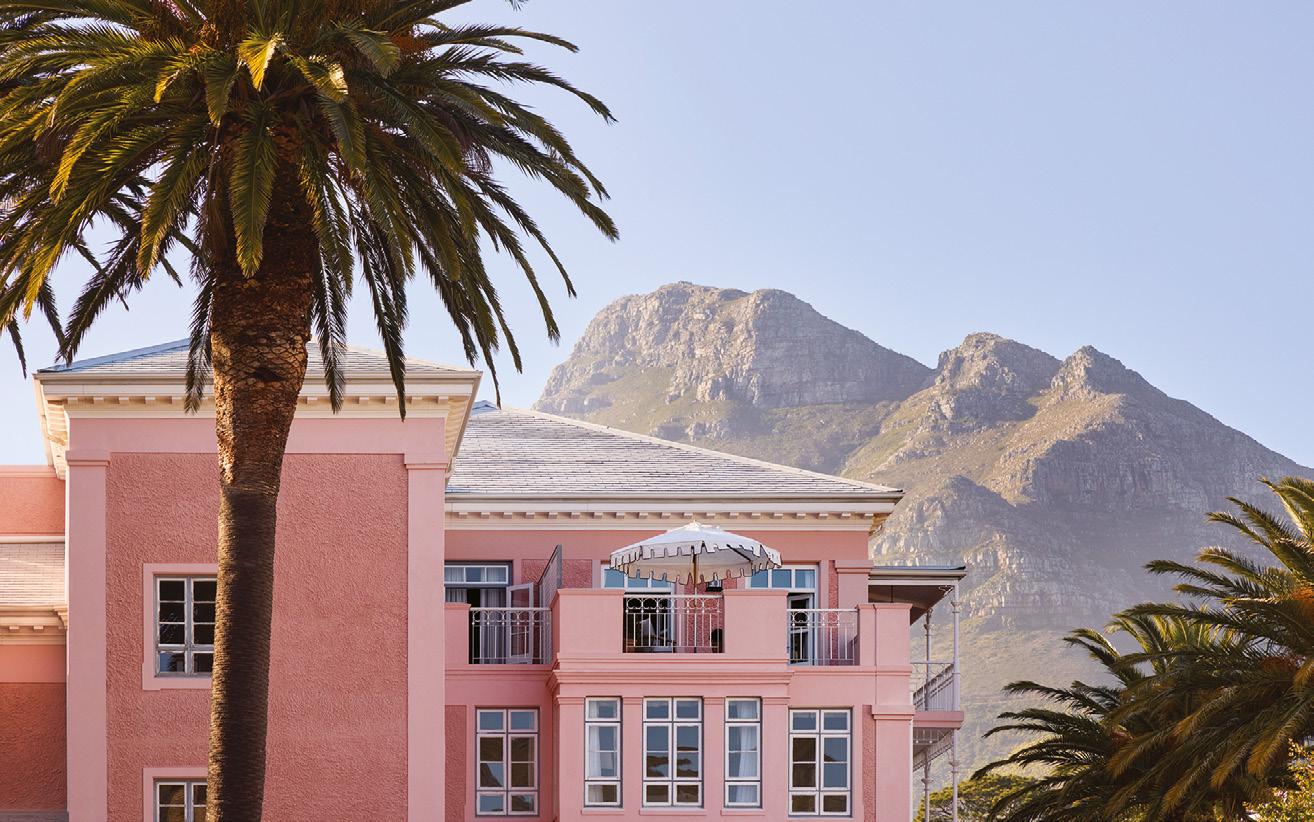 Set in the historic heart of Cape Town between the slopes of Table Mountain and the Company’s Garden, the hotel feels a world away from its city surrounds. Partly due to its sprawling seven-acre grounds, partly thanks to its respect for design. A grand palm-lined driveway framed by fountains. Immaculately manicured gardens, constantly tended to. Scalloped umbrellas shading deck chairs dressed in peach-and-cream striped towels. And, of course, the iconic powder-pink façade. So distinctive, in fact, that its hue is officially registered with Pantone as ‘Mount Nelson Pink’. Think Wes Anderson maximalism meets Barbiecore, softened by old-world country club glamour.