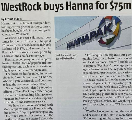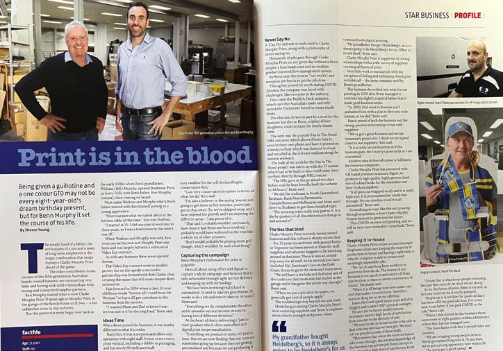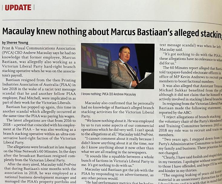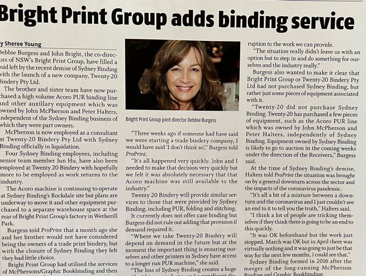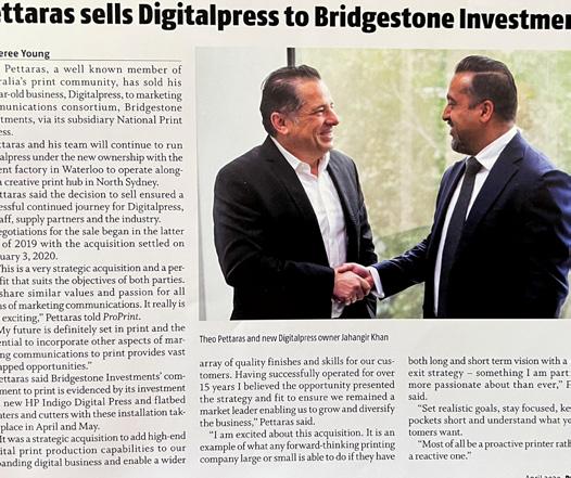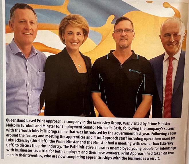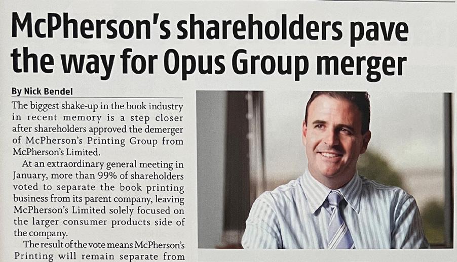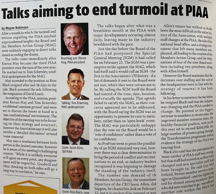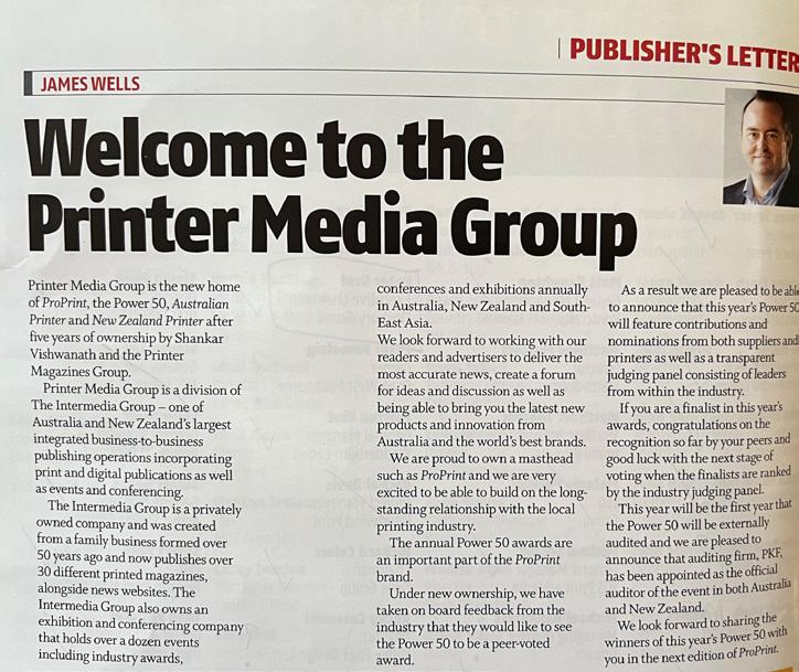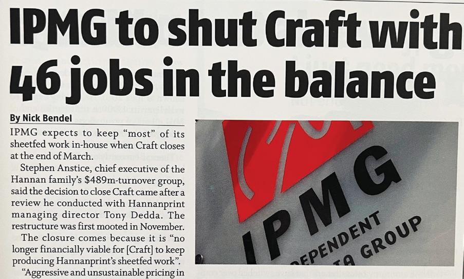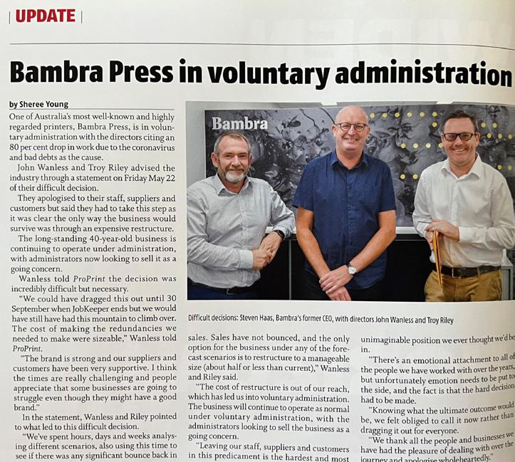 UPDATE DOWNTIME www.sprinter.com.auProPrint The women of Australia’s printing industry came together throughout May for a round of national breakfasts with mental health awareness and suicide prevention the key theme. Women in Print 2021 breakfasts a hit 1 6 119 2 3 4 5 7 10 8 AWARDS Platinum Sponsor 2021 UPDATE DOWNTIME www.proprint.com.au28 ProPrint April 2021 Over 60 members of FESPA Australia got together in March for an annual BBQ at Melbourne’s Royal South Yarra Lawn Tennis Club. The event has now been running for over 30 years with FESPA Australia president, Nigel Davies, describing it as a fantastic evening which allowed members of the industry to get together and share their news and stories. FESPA Australia hosts industry at annual BBQ 1 5 8 9 6 2 3 4 10 11 UPDATE www.sprinter.com.au14 ProPrint August 2021 by Sheree Young After going through a comprehensive restruc ture and recapitalisation plan at the end of 2020, which included closing its Melbourne print site and making 300 jobs redundant, Ovato has announced further changes. The latest announcement from the company, which is 43 per cent owned by the Hannan family, was the decision to close the Ovato Residential Distribution business on July 30, amid a continued decline in letterbox volumes. In announcing the decision to the Australian Securities Exchange, Ovato CEO James Hannan, who replaced Kevin Slaven as CEO in June, said the decision was driven by a contin ued downward slide in volumes across the resi dential distribution network. He added the costs from redundancy and leasing will be recovered well within the cur rent financial year as the company avoids ongo ing trading losses in a business where volumes have continued to steeply decline. “The impact of the COVID-19 pandemic has seen volumes across our Australian residential distribution network fall sharply since early in 2020,” Hannan said. “While the business is committed to cover ing this impact, it is now clear that the volume the network requires is some way off and the business can no longer offer this support.” Hannan said the company continues to offer unparalleled national reach and speed to mar ket via print sites in NSW, Queensland, Western Australia and South Australia. The Real Media Collective, an industry asso ciation for the paper, print, publishing and dis tribution sectors, offered its support to Ovato. “TRMC is aware Ovato has released an announcement that as at the end of July they by Hafizah Osman Southern Impact has acquired wide format spe cialist Peak Digital in a major move that will see the company increase its play in the wide for mat point of sale space. Both businesses came together on August 2 but under the terms of the acquisition, Peak Digital will retain its current brand and will continue to operate and manufacture at its cur rent premises in Seaford, Victoria. Peak Digital was established in 2006 and is currently owned by Andrew and Mel Robertson. Since then the company has established itself as a high-quality manufacturer that delivers on outcomes for a varied customer base. Southern Impact confirmed that the Robertsons and the entire Peak Digital team will continue to operate as they have, providing both customers and suppliers with complete continuity and high levels of service. Southern Impact managing director Rod Dawson said the company commenced its wide format manufacturing in August 2019 and will no longer offer Residential Distribution services across their business,” The Real Media Collective CEO Kellie Northwood said. “This is part of a committed focus of Ovato which was communicated by their new CEO and Managing Director, James Hannan, last month. Ovato is right sizing its business and maintaining a laser focus across all operations to build a strong and profitable print group. “We provide all the support we can on this journey, our industry needs healthy and per forming companies to offer stability. Whatever support the industry association can offer through this process we will provide.” Ovato shareholders have also voted to sell the company’s retail distribution businesses in Australia and New Zealand to magazine pub lisher Are Media, itself a client of Ovato and a 16.4 per cent shareholder in the company, for $15 million. The Australian Competition and Consumer Commission (ACCC) has also approved the sale of the Australian entity. The ACCC ruled the deal could proceed find ing the sale would not give Are Media a signifi cant competitive advantage. ACCC chair Rod Sims said a key concern was the impact the sale may have on competing magazine publishers and whether they would be effected by not having access to competitive distribution services. “Consistent with the ACCC’s findings when it considered Bauer acquiring Pacific Magazines in 2020, circulation and revenue of most maga zines continue to decline significantly, and many titles have closed over recent years,” Sims said. “Historical data showed that consumers that still buy magazines have a high level of loyalty to particular titles, meaning that very few con sumers would switch to an Are Media publica tion if it favoured distribution of its own magazines over its rivals’ publications. “The ACCC concluded that Are Media would have insufficient incentive to favour distribu tion of its own publications over those of other publishers.” In other changes, Ovato Creative Services, Ovato Technology, Ovato Communications and a related entity in India have also been sold to Hannan family business, Ballygriffin Holdings, for $9 million. expertise of Peak Digital provides us with eve rything required to continue our expansion plans in this sector,” Dawson said. “The way that Andrew and the team at Peak Digital deal with their customers is strongly aligned to the business approach held by Southern Impact. “We couldn’t be happier to welcome them into the fold.” Southern Impact also recently launched its new website, bringing tog