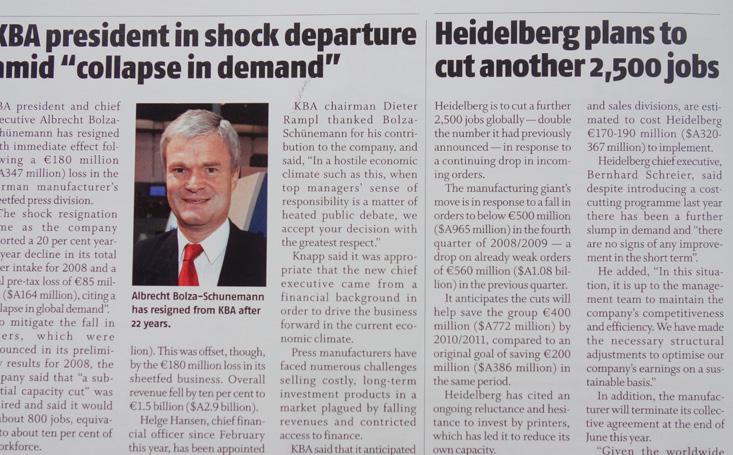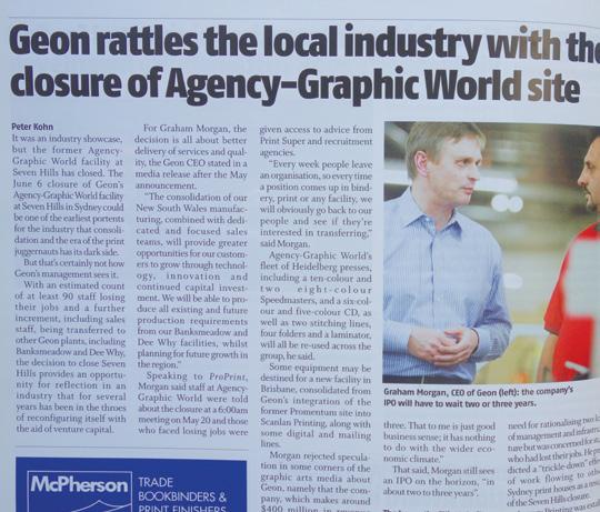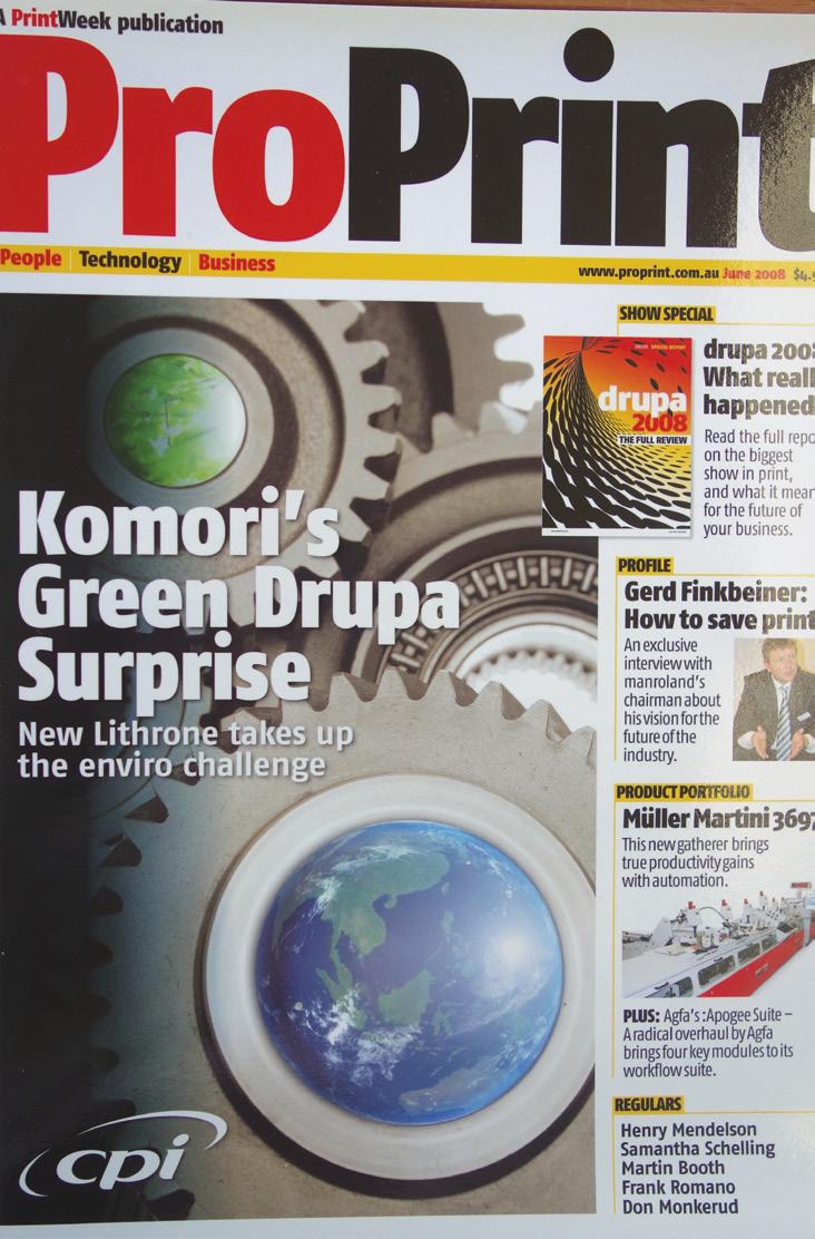 ProPrint changes hands with Don Elliott selling the magazine to Haymarket Media, owners of UK publication, PrintWeek. Geon was also making waves announcing the closure of Agency-Graphic World site in Seven Hills. It was also a drupa 2008 year so there was a flurry of new announcements including MAN Roland’s release of a new two metre plus web printer. Neil Southerington from Graffica attended drupa to show the Hamada 466 press. Commentator Andrew Tribute slammed printing associations for not doing enough to promote print in the marketing mix. There was also a great story about the print room on the Queen Victoria cruise liner.
