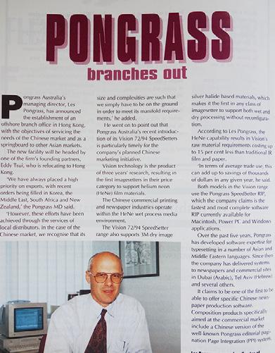 From top left: An early Currie Group Horizon ad; Holograms Fantastic and Southcorp Packaging show possibilities with this insert; Hypen management systems ad; Polychrome makes its mark; Heidelberg promotes new GTO; National Print Awards; Then NSW Industrial Relations Minister Kerry Chikarovsky with PATEFA’s Reg Waite; Pongrass Australia expands into Hong Kong; ProPrint’s cover features Agfa’s CristalRaster; The Lamb family of WA.