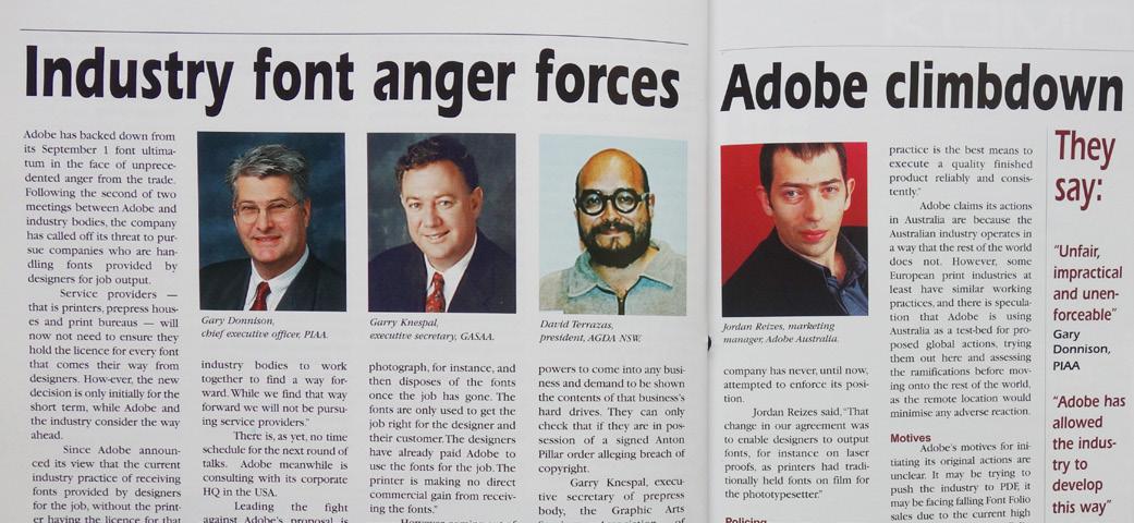 This year marked the launch of the Print21 Printing Industries Action Agenda by then Science Minister Nick Minchin. The Action Agenda provided a framework for sustainable competitive advantage and innovation in the industry. Print consultant, David Zwang, visited Australia from the US to talk about the internet’s impact on print. A key issue was a plan by Adobe to fine printers who did not hold the font license for designs they were printing. Adobe said using the fonts without the license was piracy. Major printer Diamond Press crashed out owing $171 million.