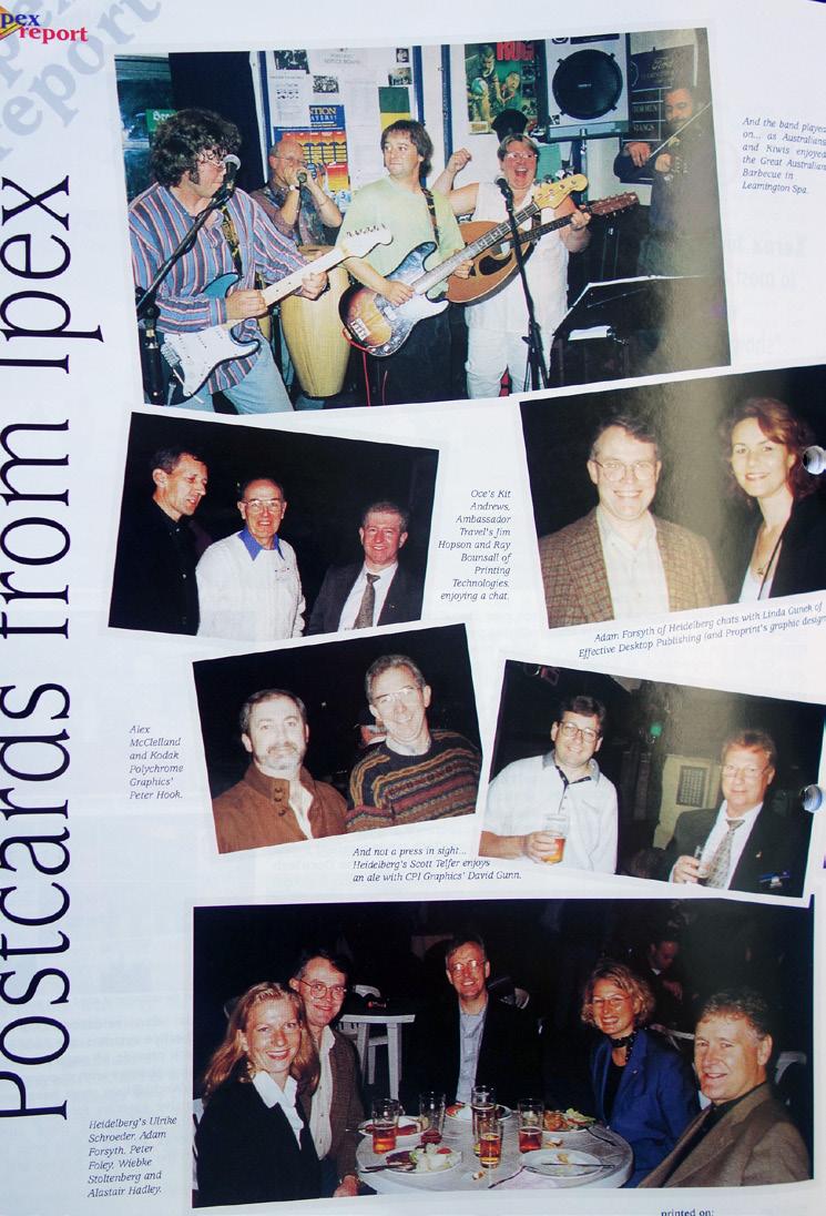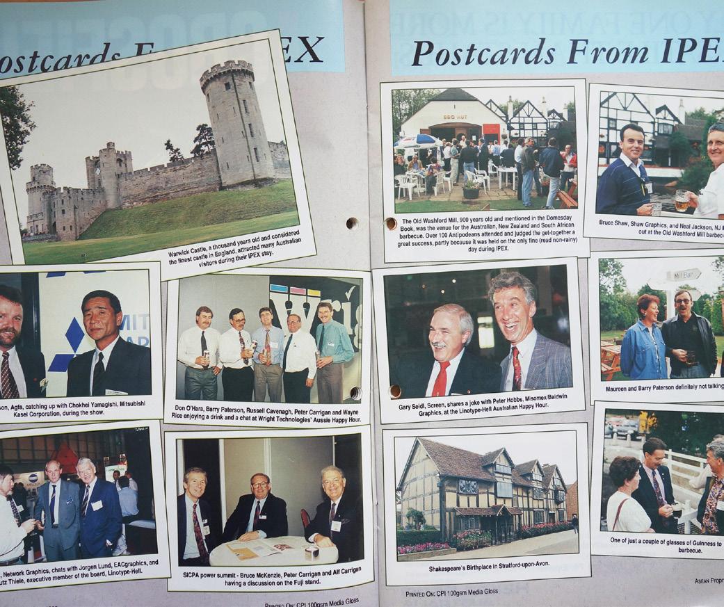 From top left: Transilwrap ad, HP calls on the Christmas theme in this ad; ProPrint’s IPEX guide cover; Dalton Paper ad; MediaPrint ad marks a change in style for the era; Postcards from Ipex’s Australian & NZ bbq; Dupont features in ProPrint; Avon Graphics acquisition; Trade show travel packages in the day.