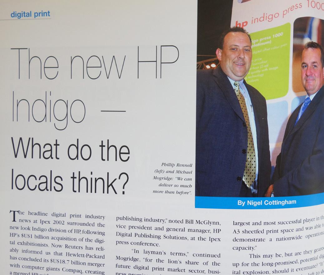From top left: PrintEx hits Sydney; NPA highlights; HP flattens the competition; Barry Webster and David Rogers of TLC feature; K.W. Doggett on the cover; Macworld coverage; Avon ad; HP announces Indigo plan; Currie Group ad for the Fuji 66IIP; Benny Landa in town; CPI feature article.