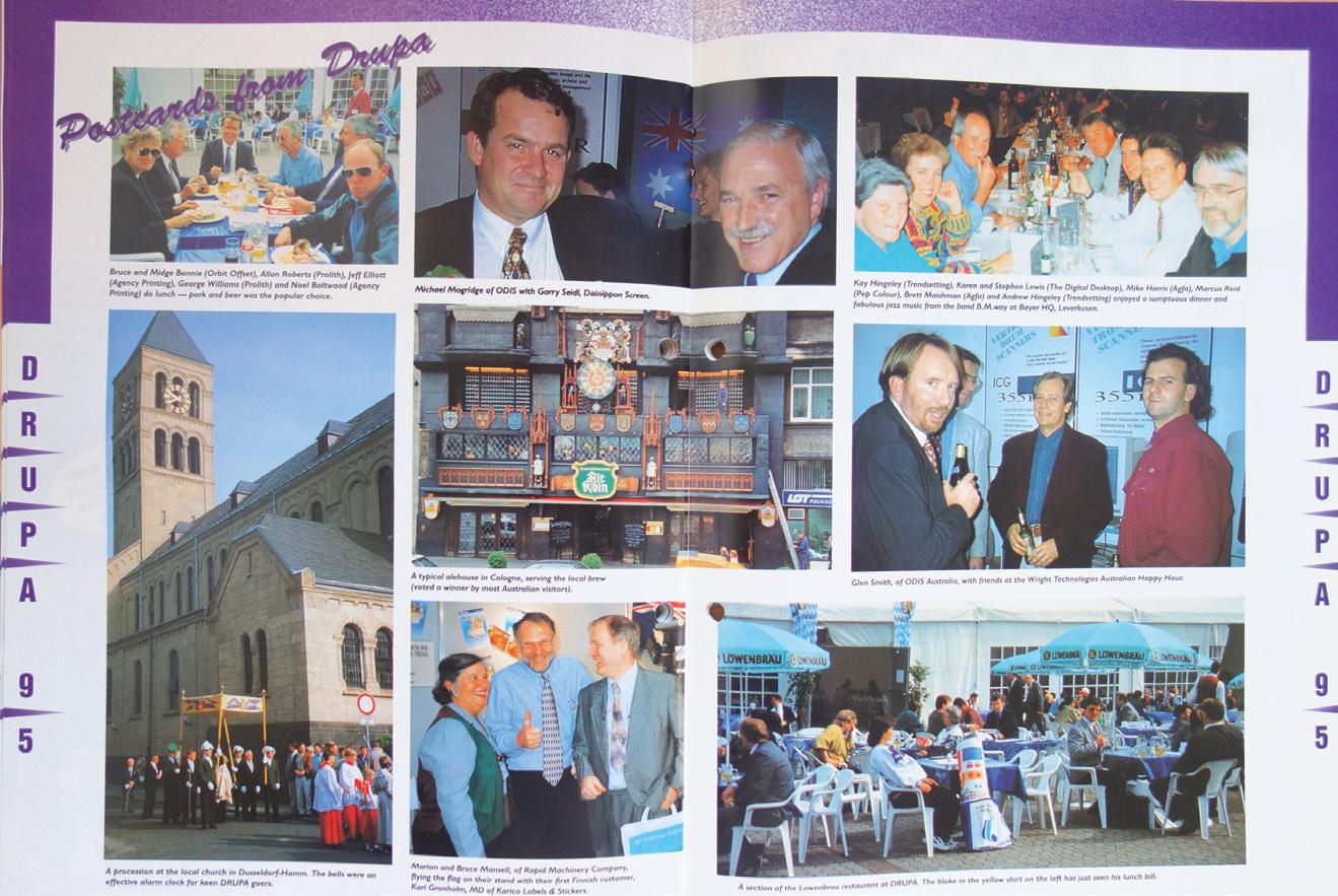 From top left: Roland 100 launched; IPEX fun; Potstill Press celebrates; Crosfield ad; Heidelberg’s M-600; Doran Printing profiled; Tom Pongrass’s new Heidelberg; Vic Premier Jeff Kennett with Polychrome’s Tom Heckels; Currie and Company MD David Currie; ProPrint’s chocolatey cover.