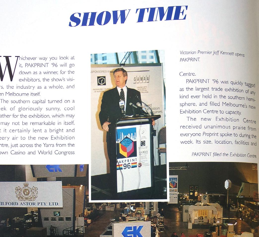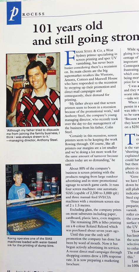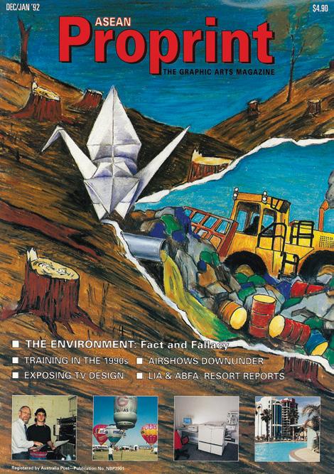 The very first issue of ProPrint in October 1991 reviewed Print ’91, a print industry tradeshow held on the shore of Chicago’s Lake Michigan. Stock Journal Printing in Adelaide, a subsidiary of Hannan Print, was featured as the first Australian site to install a Mitsubishi five colour press, the 3F. The Printing and Kindred Industries Union (PIKU) were covered on topics including membership and the 3% superannuation. Frank Steel & Co, a Sydney screen printing and spot UV varnish specialist, was also featured.