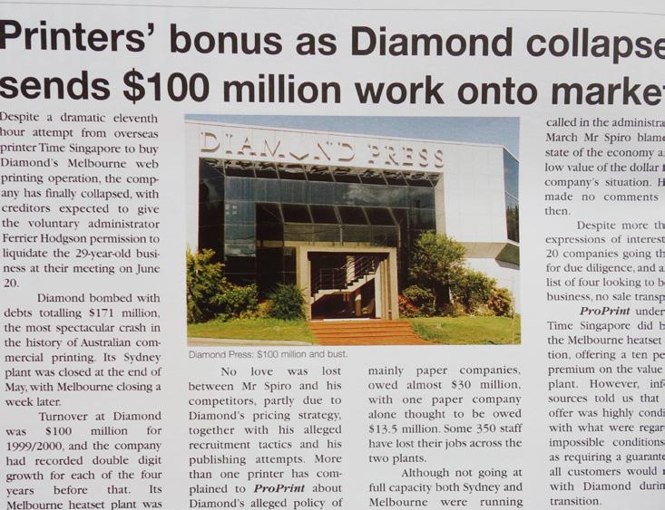 From top left: ProPrint’s PacPrint coverage wins praise; Eastern Press in the news; Screen on ProPrint cover; Foil embellishment on PacPrint preview; Print21 Action Agenda launched; Industry furious over Adobe font fuss; David Zwang visits Australia; Heidelberg ad; Creative Fuji Xerox ProPrint cover; Diamond Press hits the skids owing millions.