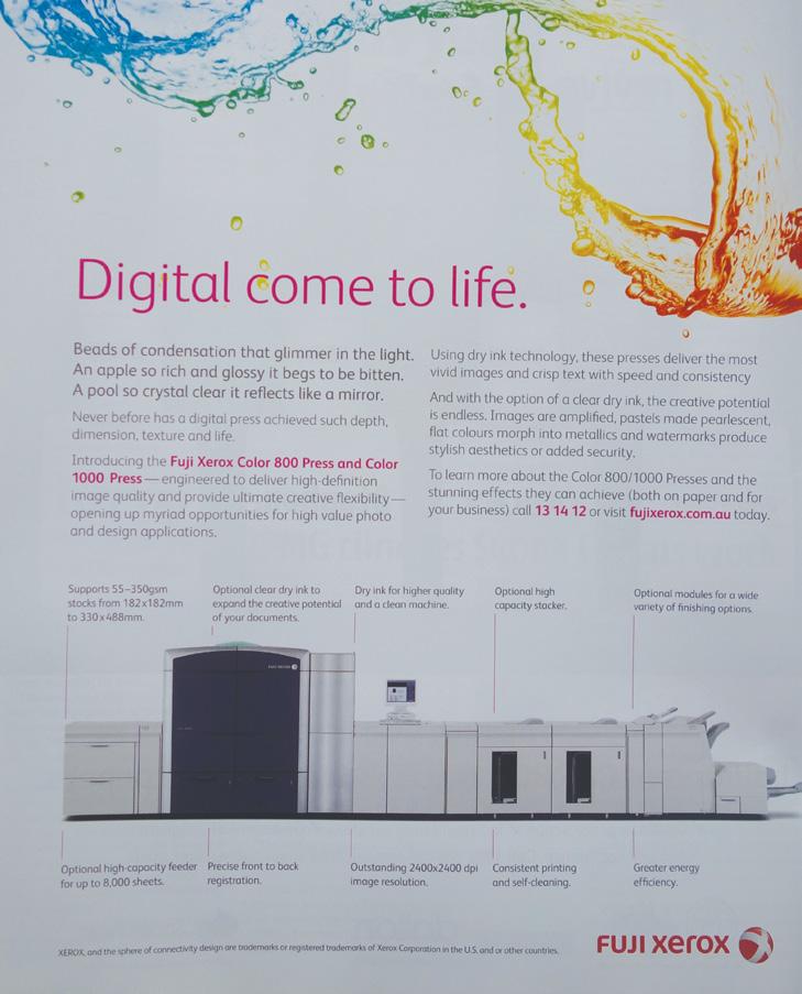 From left to right: Fujifilm’s new Jetpress; A round up of industry news of the time; ProPrint’s Ipex cover; Fuji Xerox ad; Pettaras Press was close to sale; Preparations underway for Visual Impact; Gunns controversy continued; PMP takes on Geon and Blue Star with the purchase of a new sheetfed press..