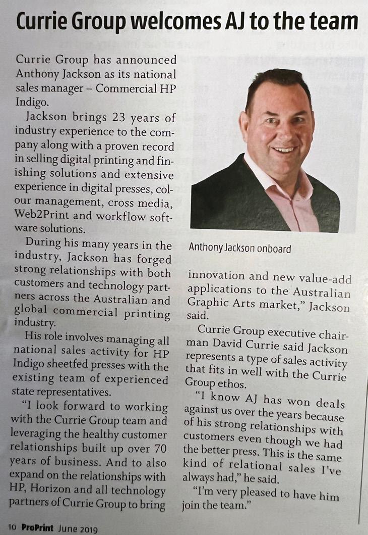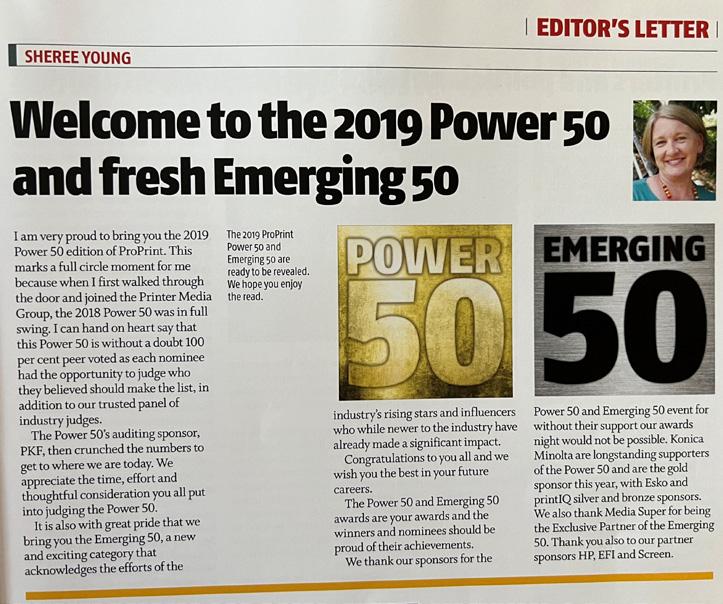Left to right: Currie Group welcomes Anthony Jackson; Currie Group hosts open house; Graffica’s Neil Southerington makes an impression; ProPrint Emerging 50 launched; Whirlwind Print liquidates; Sprinter.com.au launched; Power 50 and Emerging 50 share the cover; PrintEx19 photo highlights; Massivit 3D hits Aussie shows; Taylor’d Press in the star business; PrintEx19 preview package and Steven Gamble’s Man Anchor journey.