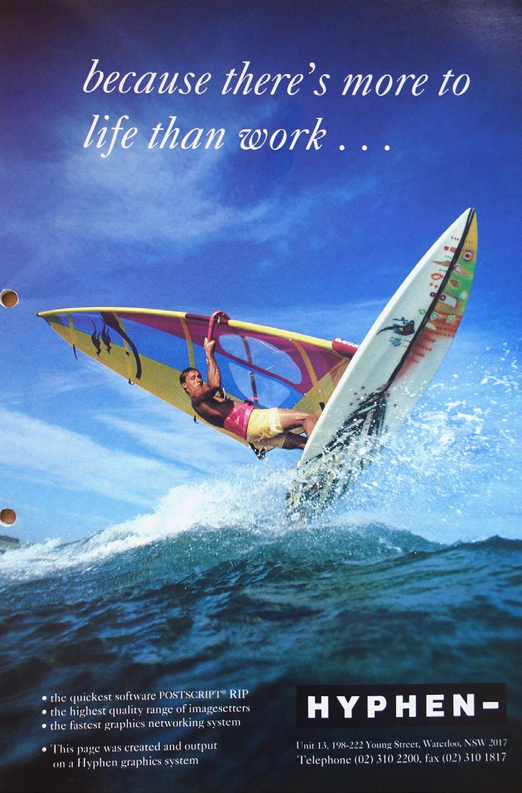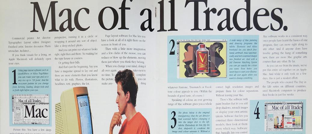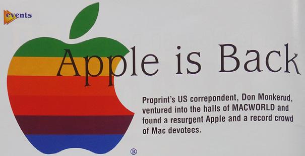 From top left: A Heidelberg Muller Martini ad; APPM ad shows the strength of Aussie paper; Inprint tells all; Sony Music opens huge print site; Hyphen ad; A standout ProPrint cover; Apple Macintosh move in; Rawson Graphics’ John Cable and Peter Finch in the Big Bash; Linotype-Hell ad; Xerox Docutech makes a splash.