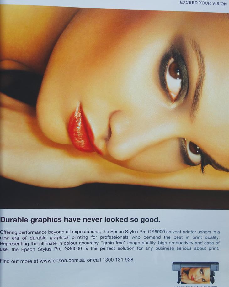 Epson’s signage and décor printers deliver higher image quality with superior colour and gradation. They offer wide media support and cost-effective production backed with on-site CoverPlus extendable up to 5 years. From indoor POS, outdoor signs, back-lit displays, window decorations, banners and vehicle wraps to wall coverings, floor stickers, custom cabinetry, flags and merchandise, Epson has the selection for you. www.epson.com.au/prographics DYE SUBLIMATION INK PIGMENT INK ECO-SOLVENT INK RESIN INK Total Signage Solutions from the Vendor You Can Trust. UV INK