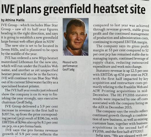 This was a tumultuous year for the print industry with the key association splintering amid a flurry of member discontent and board resignations. Andrew Macaulay replaced Jason Allen as the PIAA’s new CEO and set about using his experience in corporate turnarounds to address the issues. Kellie Northwood, the now CEO of The Real Media Collective, which is about to merge with the former PIAA, was appointed to the PIAA board in 2016, along with IVE's CEO Matt Aitken.