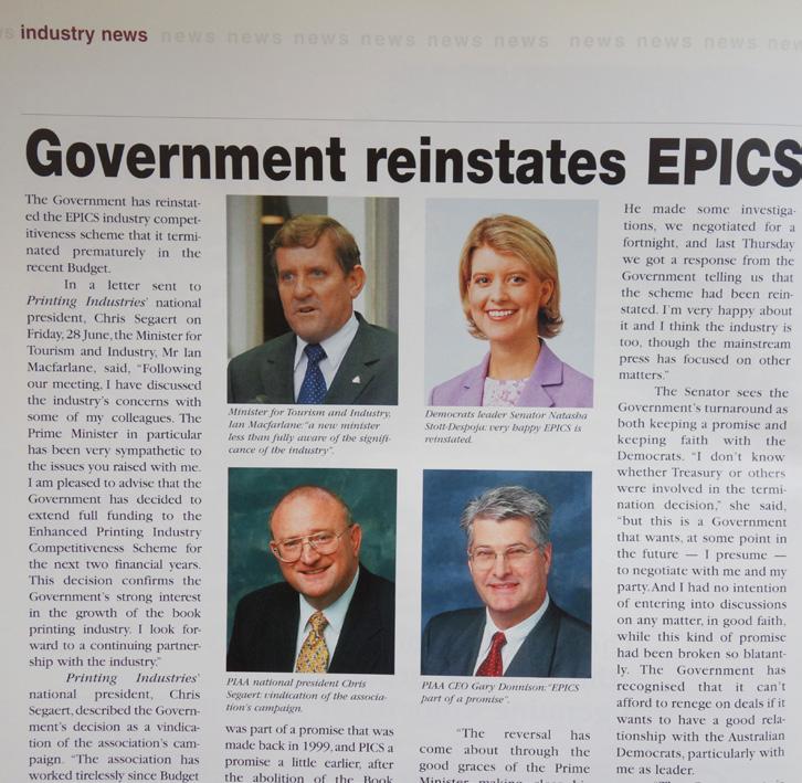 From top left: GASAA attendees; Jeff Kennett opens Pakprint; SICPA ad; Rhino Ink feature; David Currie doing deals; industry identities at Pakprint; Xeros ad; Holograms Fantastic; Associations merge; ProPrint’s Pakprint guide; NPAs grow.