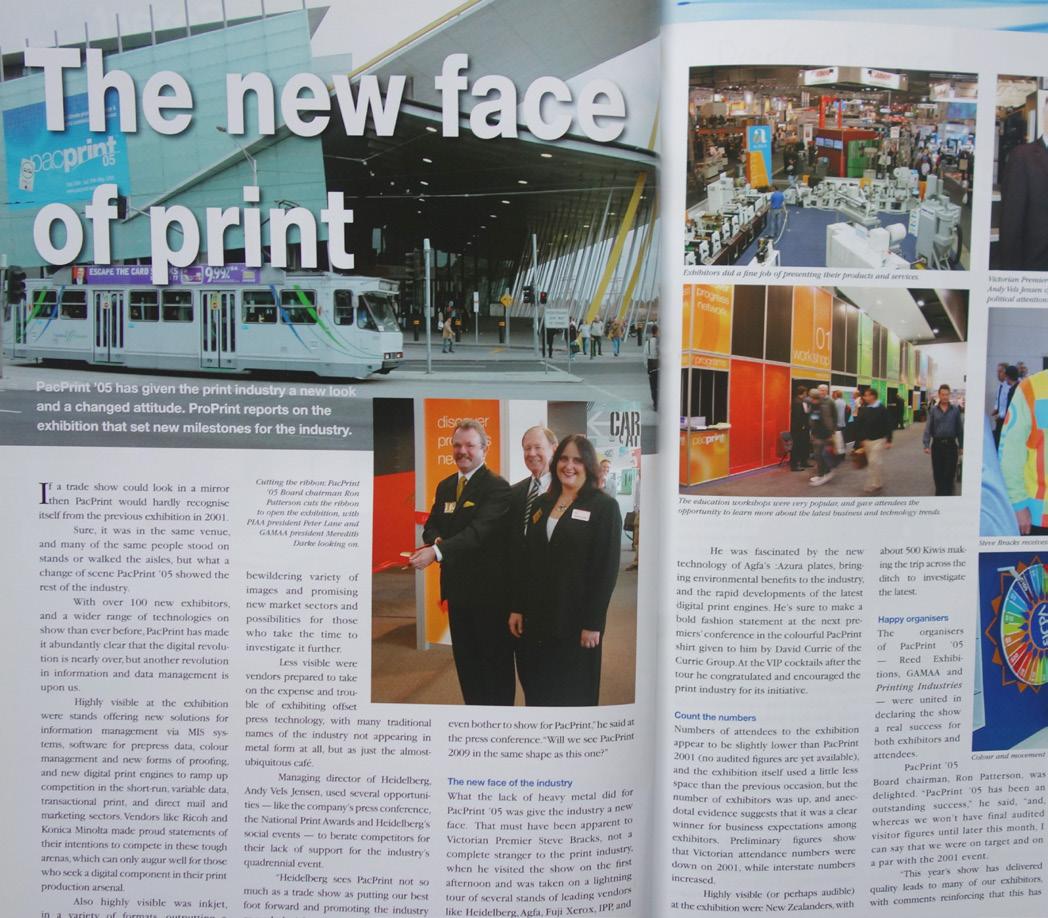 PacPrint 2005 burst onto the scene, bigger and better than ever. CPI guests could even arrive by helicopter and David Currie had no problem giving then Victorian premier Steve Bracks some fashion advice. Digital printing was really coming into its own with Konica Minolta out promoting its Bizhub series, along with Currie Group making sure everyone knew about the wonders of the HP Indigo. At the same time, Norske Skog signalled a reduction in newsprint production and Clive Denholm signed off as CEO at his Worldwide Online Printing business.