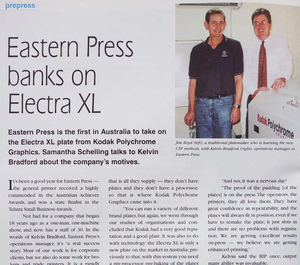 From top left: Kodak Polychrome on the drupa preview; Chippendale Printing in the news; EFI ad; A humourous correction; KBA’s iPrint install; Agency Printing featured on the ProPrint cover; Platypus goes hybrid; Bottcher ad from the day; Fuji Xerox’s creative at the time; David Currie features on the cover of ProPrint; Interview with Warwick Roden; Currie Group’s growing team.
