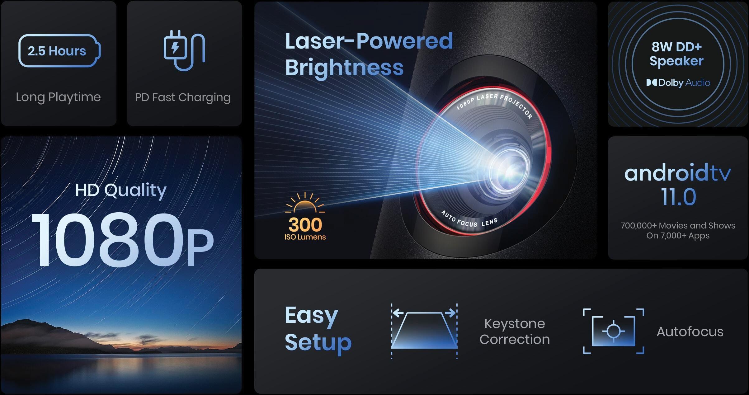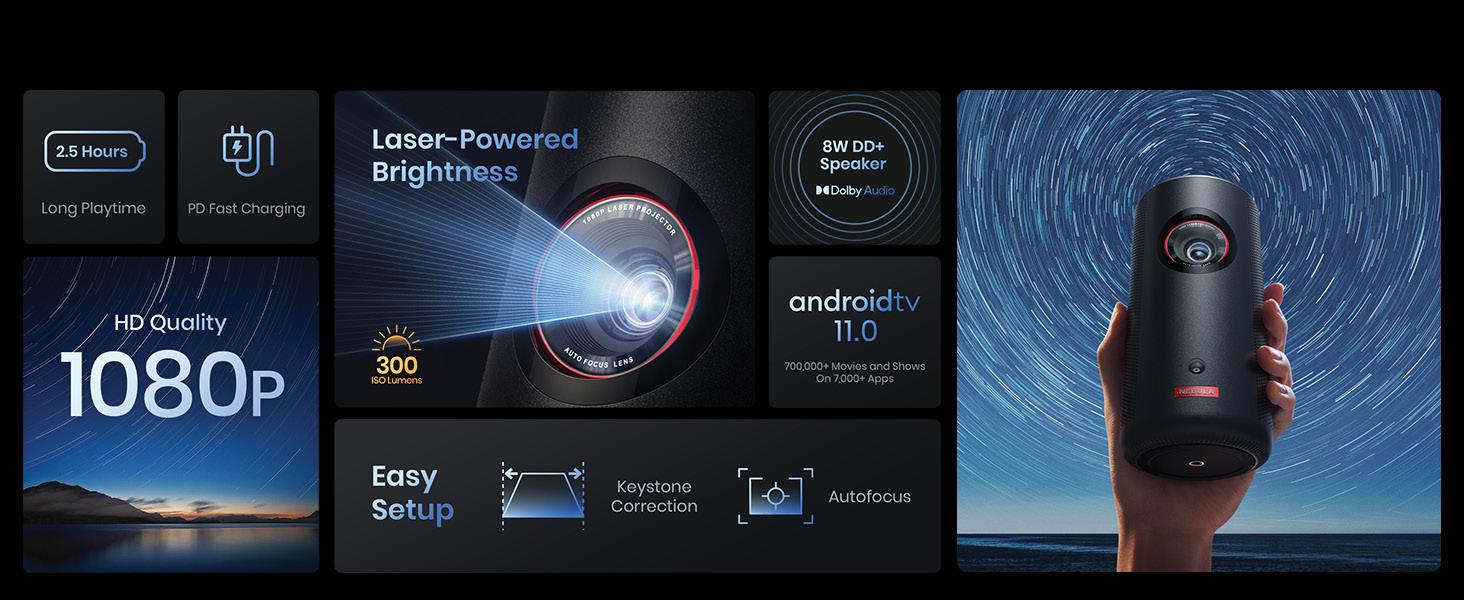 Anker also introduced the new Nebula Capsule 3 Laser, small enough to fit in a hand. The 1080p HD display with 300 ISO lumens claims to be 1.8 times brighter than a traditional LED. AndroidTV 11.0 OS is supported by an 8W built-in speaker with Dolby source decoding.