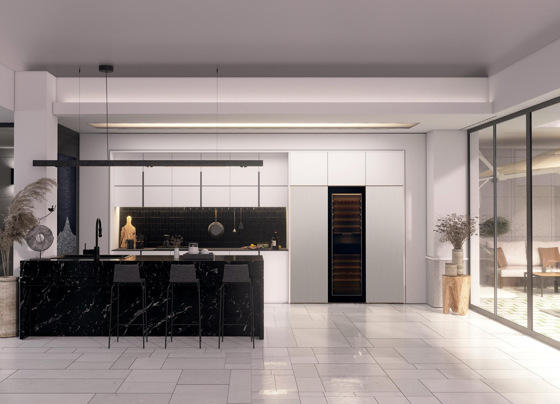 KNOWN AS Infinite Design, the exterior is made from premium aluminium for dentand scratch-resistance, the Auto Open Door is opened with a simple touch and the Dual Auto Ice Maker offers a choice of whisky ball ice or cubed ice. The wine cellar features a triple temperature zone, UV Protect door and is compatible with the SmartThings Smart Wine Storage wine management feature.