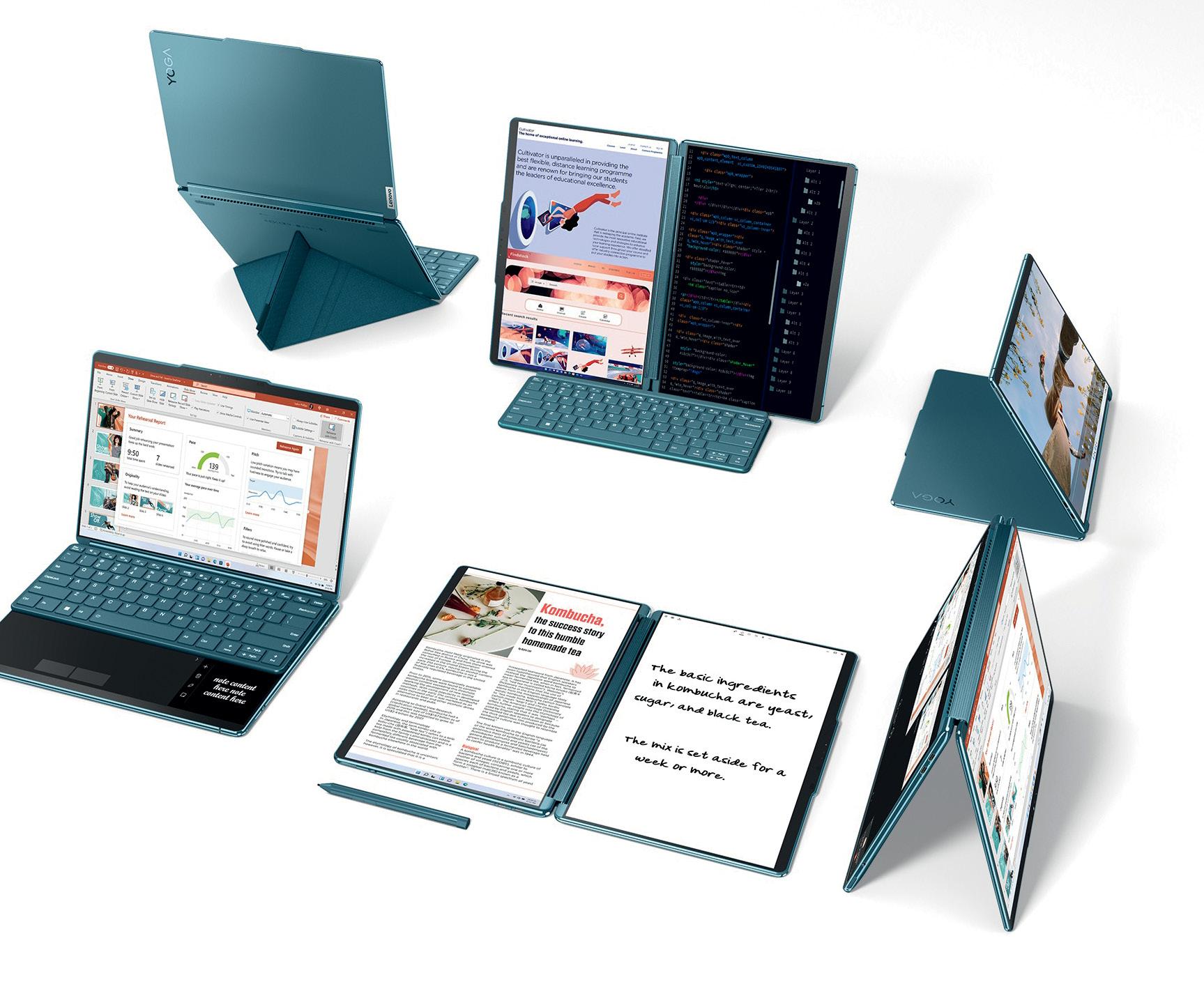 THE NEW Yoga Book 9i is the first full size dual screen OLED laptop built on the Intel Evo platform. Powered by a 13th Gen Intel Core i7-U15 processor, up to 16GB of LPDDR5X RAM and with a Gen 4 PCIe SSD up to 1TB, the Yoga Book 9i includes dual 13.3-inch 2.8K resolution touch displays that are Dolby Vision compatible in 16:10 aspect ratio with support for multi-touch gestures. The laptop includes a 360-degree rotating soundbar and comes with a folio stand and detachable Bluetooth keyboard with support for the Lenovo-designed Smart Pen stylus.