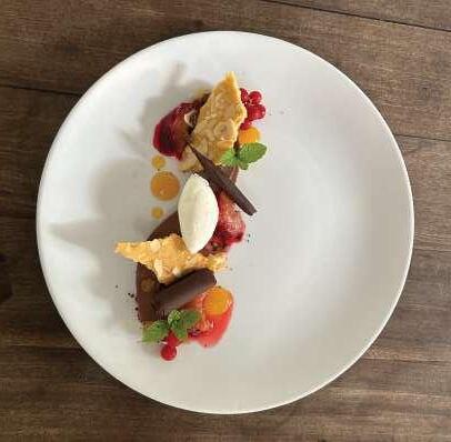 2. Place 2 small baked frangipane on alternating sides, pipe the mango gel on the plate, and finish with mint leaves and chocolate.