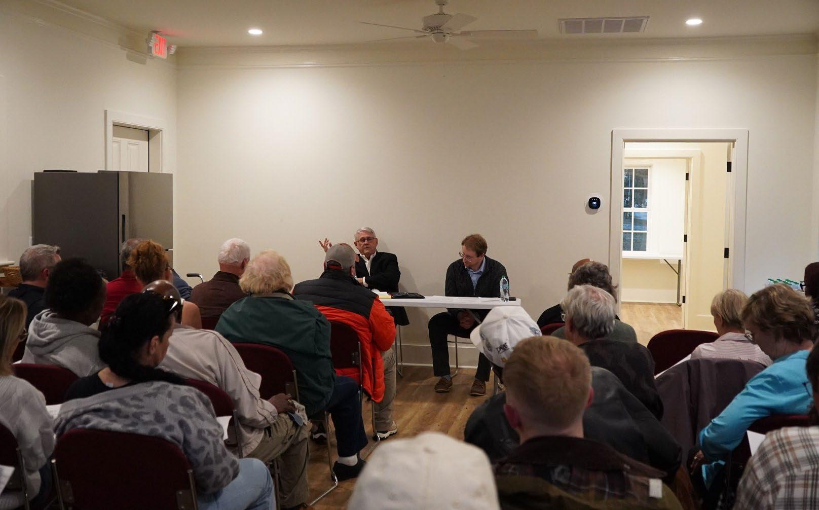 Port Royal Mayor Kevin Phillips, along with council members Jorge Guerrero, left, and Darryl Owens, right, discuss the settlement agreement approved on Wednesday, Feb. 12, 2025, which permits Safe Harbor Marinas to move forward with the redevelopment of the Port of Port Royal.