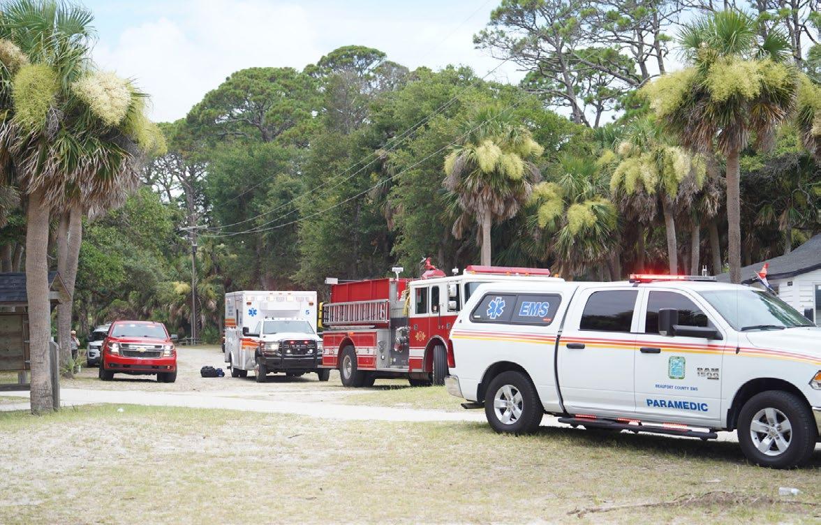 First responder vehicles at North Beach at Hunting Island State Park on Friday, July 4, 2025. Paul Peters, 38, of Indian Trail, N.C., died Friday from drowning. Amber Hewitt/The Island News