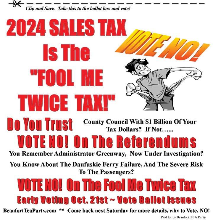 The Beaufort Federation of Republican Men announced (Oct. 10) they will not be supporting the County’s Transportation Sales Tax Referendum and urges voters to vote ‘no’ on Ballot Question No. 1 (the TST) and also vote ‘no’ on Question No. 2 (the bond) on the upcoming November 5 ballot.