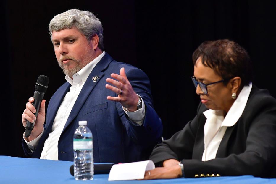 Republican candidate for Beaufort County Council David Bartholomew, left, discusses his views on controlling growth while his Democrat opponent Marilyn Harris takes notes during the Candidate’s Forum on Wednesday at the University of South Carolina Beaufort Center for the Arts. Both County and City Council forums were sponsored by the Beaufort Regional Chamber of Commerce. Bob Sofaly/The Island News