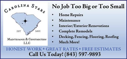 B8 OCTOBER 27–NOVEMBER 2, 2022 SERVICE DIRECTORY ATTORNEY Christopher J. Geier Attorney at Law, LLC Criminal Defense & Civil Litigation 16 Professional Village Circle, Lady's Island Office: 843-986-9449 • Fax: 843-986-9450 chris@bftsclaw.com • www.geierlaw.com AUTOMOBILE SERVICES Zippy Lube, Inc. www.zippylubebeaufortsc.com zippylubeinc@gmail.com 843-522-3560 Quick Lube and Full Service Automobile Repair Ronnie Kizer, Owner 149 Sea Island Parkway • Beaufort, SC 29907 AUDIOLOGY & HEARING Beaufort Audiology & Hearing Care Monica Wiser, M.A. CCC-A Licensed Audiologist 38 Professional Village West, Lady's Island, SC 29907 monica@beauforthearing.com www.beauforthearing.com | 843-521-3007 Hear the Beauty that Surrounds You The Beaufort Sound Hearing and Balance Center Dr. Larry Bridge, AU.D./CCC-A 206 Sea Island Parkway, Suite 31, Beaufort, SC 29907 thebeaufortsound@gmail.com www.thebeaufortsound.com | 843-522-0655 1001 Bay St, Beaufort, SC 29902 open Mon-Sat 10-5, Sun. by chance furniture, home decor & more (843) 379 4488 Allison & Ginny DuBose, Owners aldubose@yahoo.com • www.baysttreasures.com FURNITURE / HOME DECOR Manufactured Housing Insurance 102 Sea Island Parkway, Suite 0 • Lady's Island, SC 29907 Fax: 843-524-6928 John D. Polk: 843-524-3172 • Leslie Lynam: 843-524-3172 polkagency@gmail.com MOBILE HOME INSURANCE John D. Polk Agency A U T O Site Built Homes GARDEN CENTER 1 Marina Blvd. • Beaufort • 843-521-7747 www.LowCoGardeners.com • Mon-Sat 8-6 Retail Garden Center Serving Beaufort & LowCo Areas Visit Our Retail Garden Center Plants • Flowers • Gifts • Coffee Other Services Include: Plant Design • Consultation Install • Landscape Maintenance PRESSURE WASHING Pressure Washing • Window Cleaning Soft Roof Wash • Residential & Commercial 843-522-3331 CHSClean.com Locally Owned and Operated Furbulas Dog Grooming andPet Sitting Brittany Riedmayer 843-476-2989 • 843-522-3047 furbulasdoggrooming@hotmail.com Member of National Dog Groomers Association of America PET SERVICES ROOFING DA Roofing Company Donnie Daughtry, Owner Call us for ALL of your roofing needs. New Construction, Residential and Commercial, Shingles, Metal, Hot Tar & Hydrostop. All repairs and new additions. FREE ESTIMATES 843-524-1325 WINDOW TINTING TOP-Quality Window Tinting Services for Your Home, Business & Automobile 843-525-1710 www.lowcountrywindowtint.com FEED & SEED PET SUPPLIES COLE’S BIRD SEED LOCAL HONEY GOAT SOAP • CBD OIL LAWN & GARDEN NEW OWNERSHIP & NEW INVENTORY 347 Sea Island Parkway, Lady’s Island, SC 29907 HOME CARE SERVICES PEST CONTROL residential commercial real estate 843-379-0185 www.BeaufortPestControl.com TRAILER REPAIR COINS AND COLLECTIONS WANTED : Southeastern Coin Exchange FL, GA, & the Carolinas. Call “Guy” at 843-986-3444. Free appraisals. Highest prices paid. Over 60 years experience. Licensed. Private appointments available. COINS & COLLECTIONS FAMILY SERVICES Subscribe! Safe Direct Delivery To Your Mailbox! Receive The Island News Every Week & Lowcountry Weekly Every Other Week! ONLY $12 per Month or $100 per Year CALL 888-475-6397 That’s 888–ISL–NEWS Or Go Here! Or Here: https://yourislandnews.com/subscribe/ Beaufort’s Hometown Newspaper & { Opinion, Arts, Culture, Lifestyle, Cuisine } CONSTRUCTION DNA & OTHER TESTING SERVICES HEALTH INSURANCE 2023 Open Enrollment Healthcare.Gov and Medicare Advantage Insurance 69 Robert Smalls Parkway • Beaufort Call us today at 843-521-7819 mdburns.com • mike@mdburns.com OPEN ENROLLMENT Book Your Life Passages In We Run Classified & Display Advertising In the Following Categories: •Engagements •Weddings •Births •Legals •Death Notices •Obituaries For information contact Amanda Hanna 843-343-8483 or Amanda@LCWeekly.com CHIMNEY SERVICES O. W. Langford, Jr. 843-812-7442 843-441-9162 Ask about our home services! Top HatChimney Services