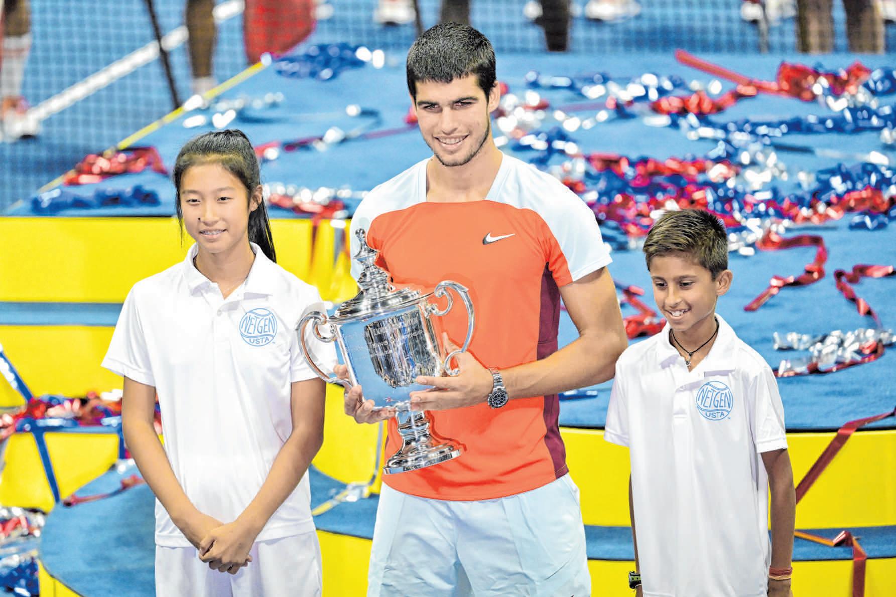 2022 champion, Carlos Alcaraz and Nassau Co. 12-year-old Brij Vashist (right) pose with the trophy after Alcatraz wins a men’s singles championship match at the 2022 US Open, Sunday, Sep. 11 in Flushing.