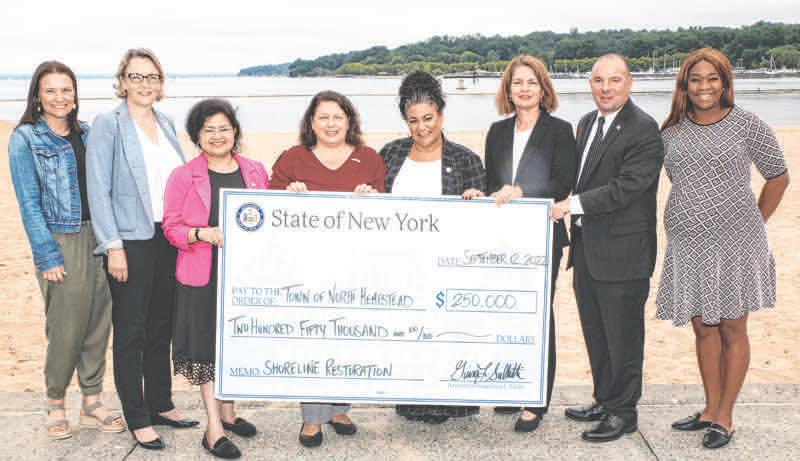 North Hempstead Town Su pervisor Jennifer DeSena, Council Members Peter Zuckerman, Veronica Lurvey, and Mariann Dalimonte and Town Clerk Ragini Srivastava were proud to welcome State Assembly woman Gina Sillitti to North Hemp stead Beach Park in Port Washington on Sept. 12 as she presented the Town with a check for $250,000.