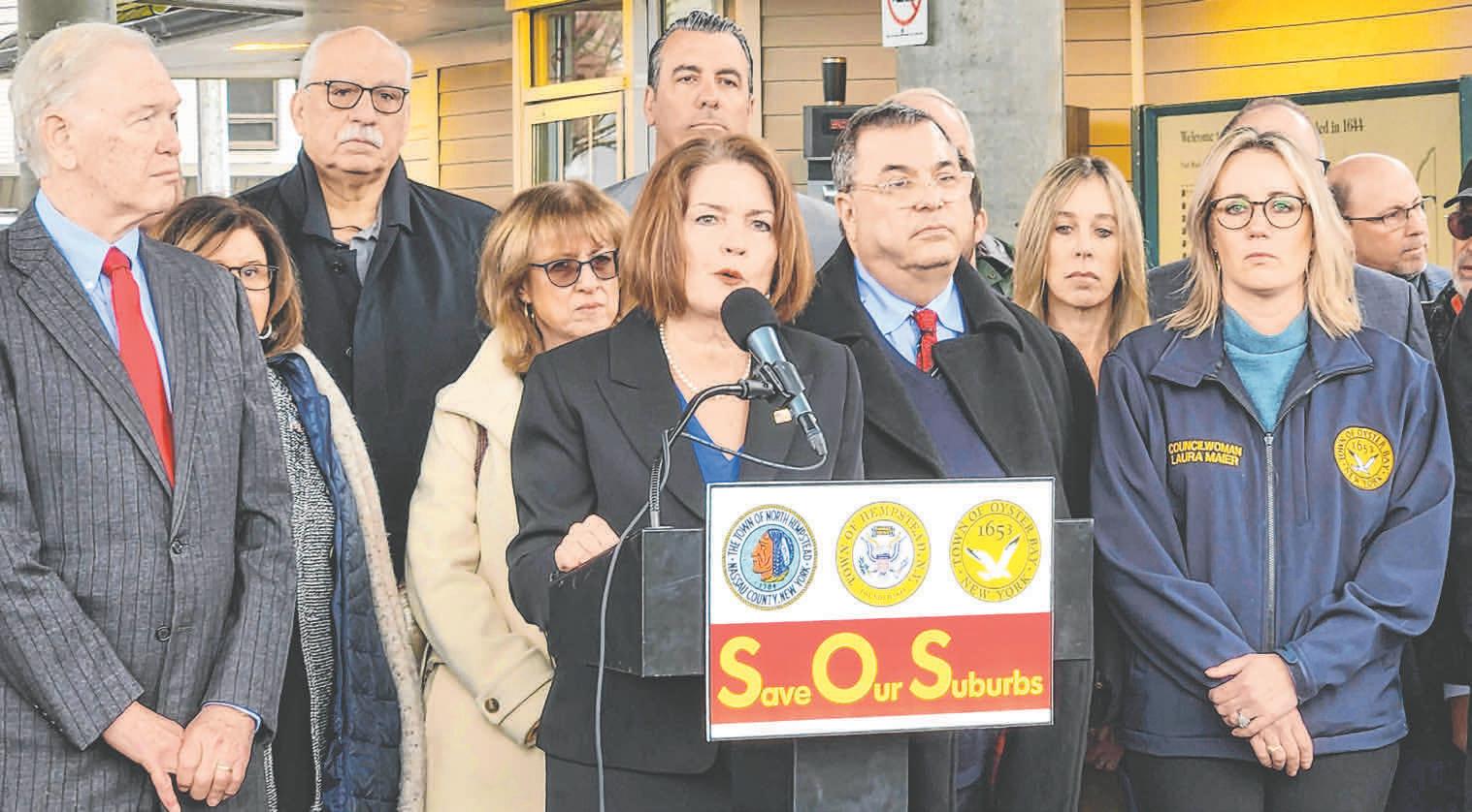 Nassau County officials stood outside the Port Washington LIRR station Thursday, calling for “local control, not Hochul control” in re-