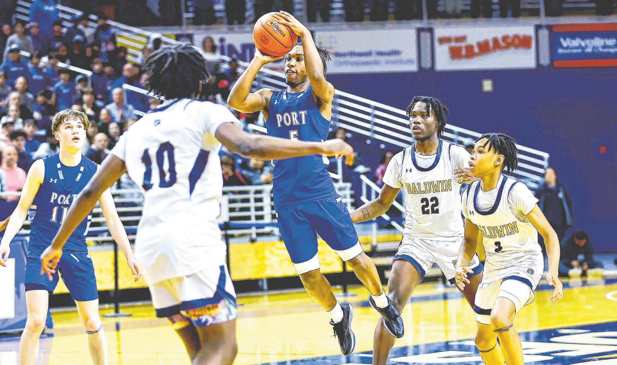 But Baldwin’s Jaylen Brown answered with a tough 3-pointer from the left corner, with two defenders on him, to push the Bruins back up 38-35, and Port Washington could never come back from that.