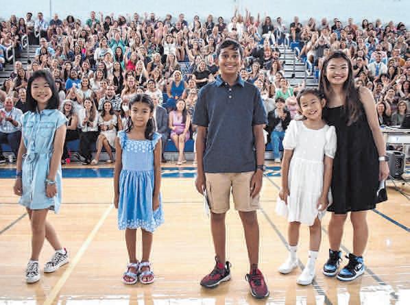 Herricks students are all smiles following their presentations at the district’s annual opening day convocation where they related to attendees why Herricks is special to them. Denton second grader Riley Xu, left, Searingtown second grader Isla Powers, Herricks Middle School eighth grader James Persad, Center Street fifth grader Sophia Wang and Herricks High School twelfth grader Julia Yam, right.