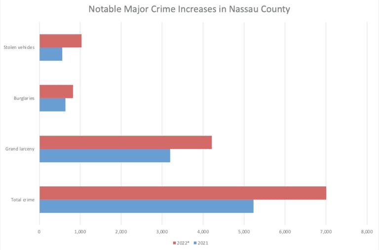 Nassau County is on pace for more than 7,000 major crimes this year, roughly a 34% increase over the 5,230 major crimes reported throughout the county in 2021, according to statistics from the Nassau County Police Department.