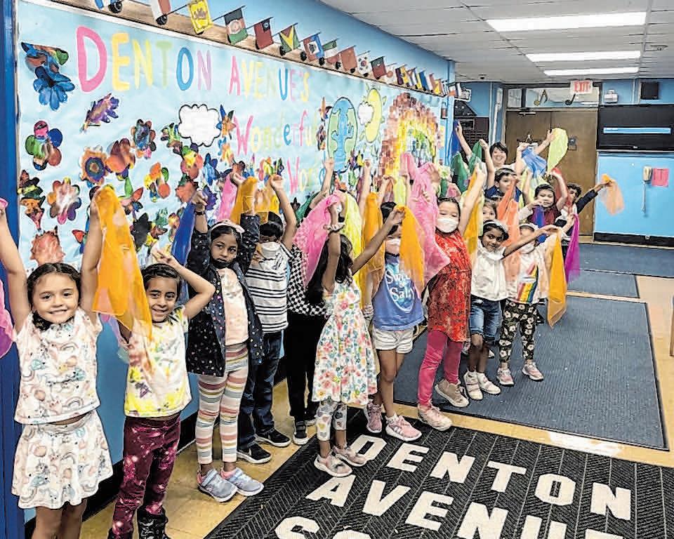 Denton Avenue students perform a scarf dance to the song “What a Wonderful World” under the “Denton Avenue’s Wonderful World” mural created by the students.