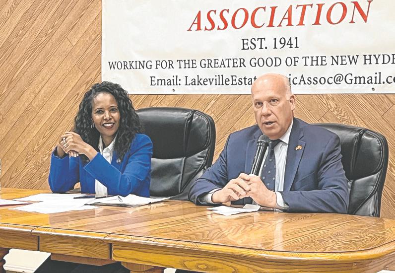 Legislators Mazi Melesa Pilip and Scott Strauss responded to resident concerns at a Lakeville Estates civic meeting Wednesday night, including a barrage of questions about their support of Nassau County Executive Bruce Blakeman’s special deputy sheriff program and a Las Vegas Sands proposal to build a casino at the Nassau Hub.