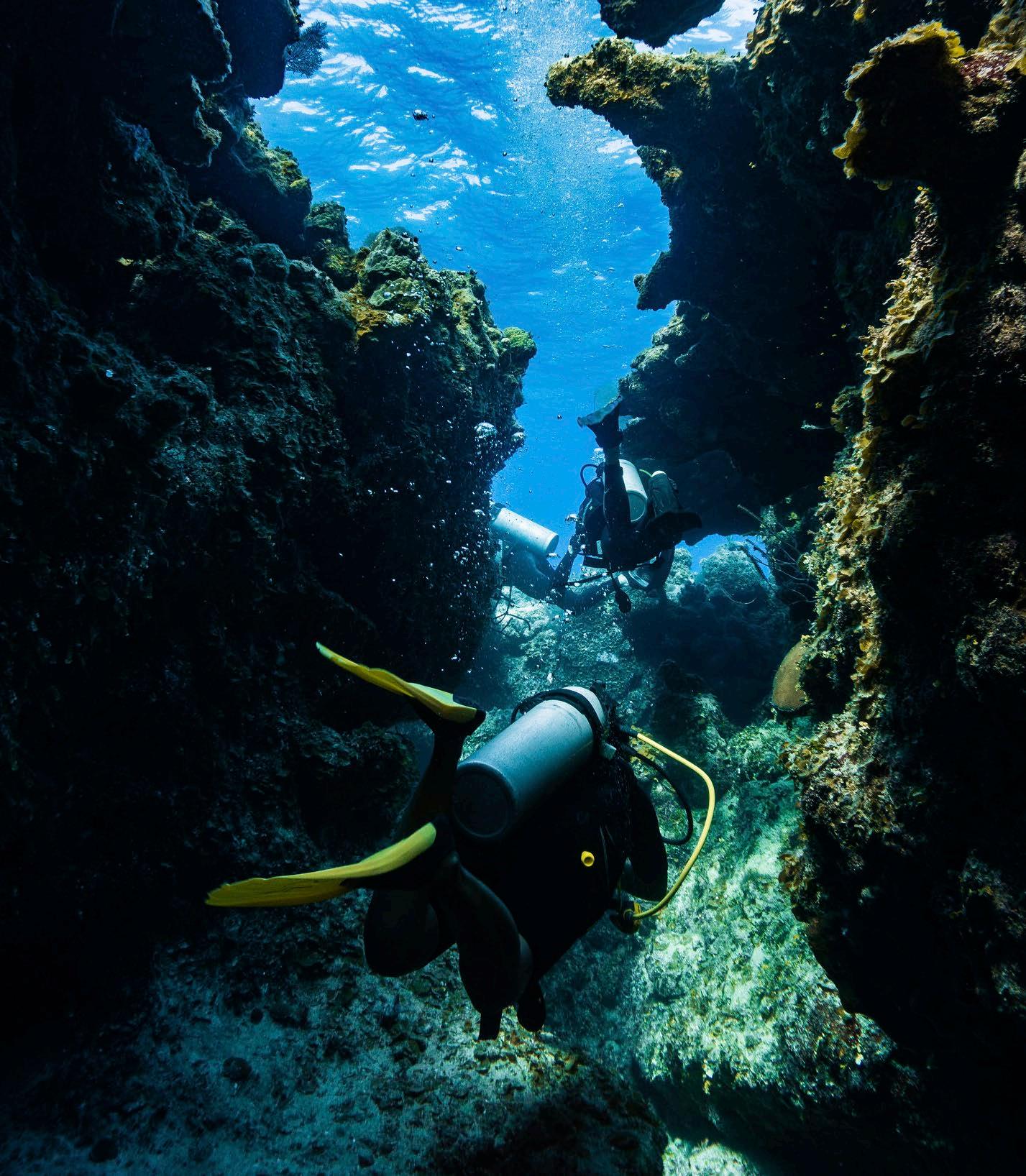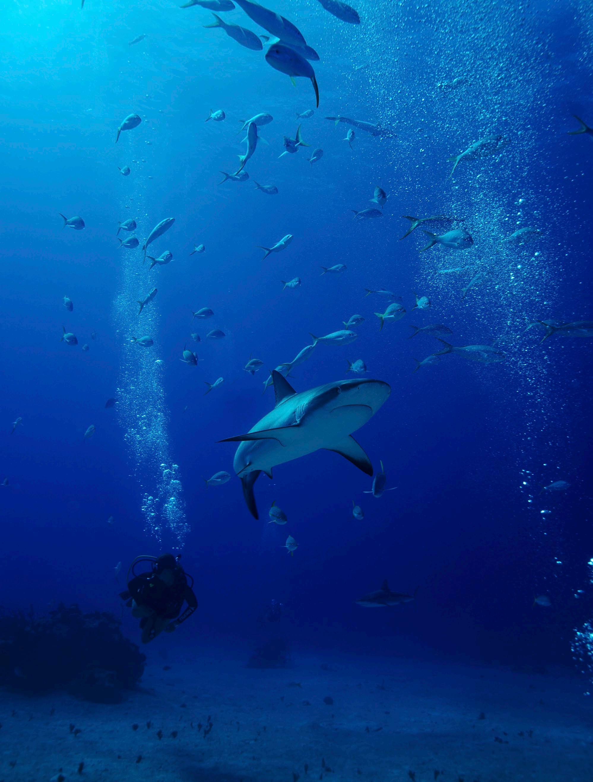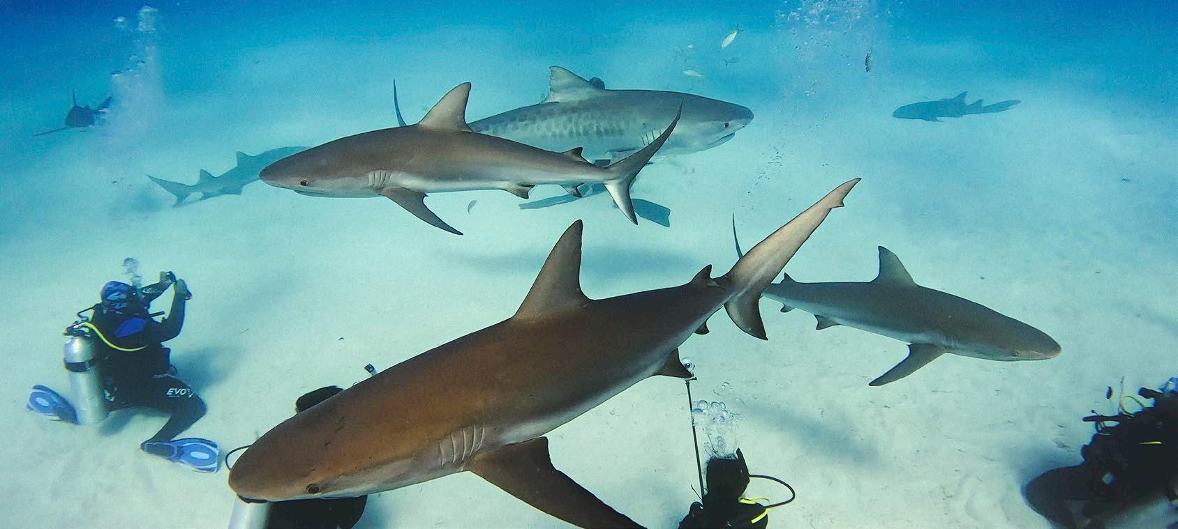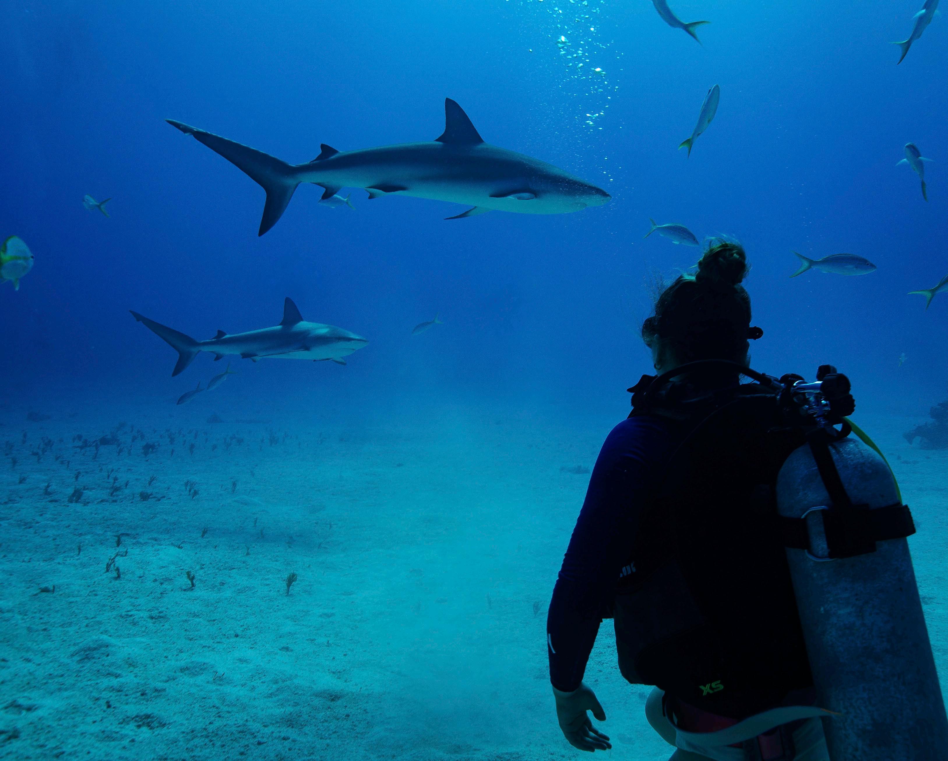 Field work observing carribean reef and tiger sharks