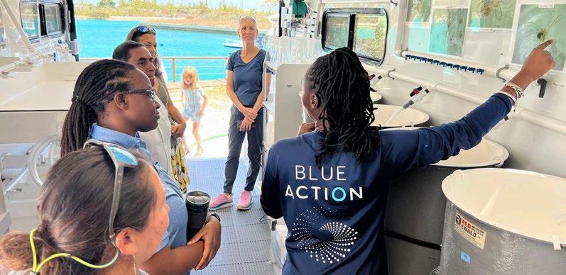 CEI’s Queen Conch team observing conch broodstock with Dr. Davis at the Blue Action Lab Mobile Hatchery.